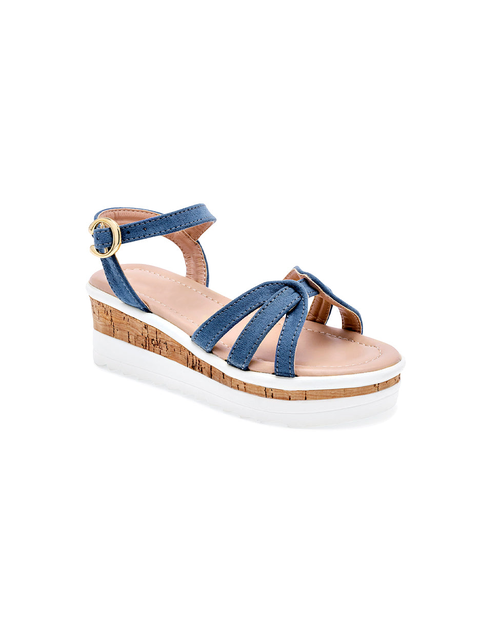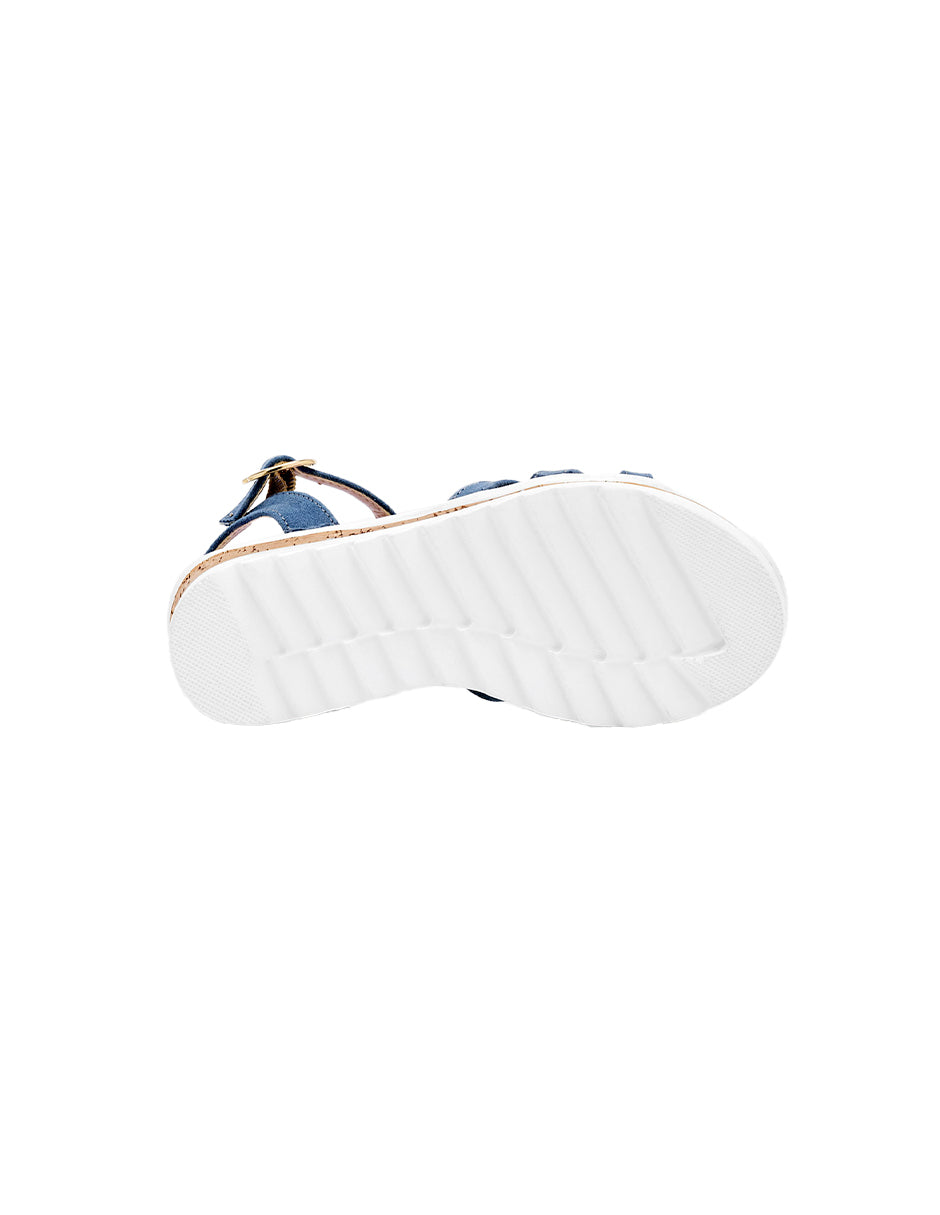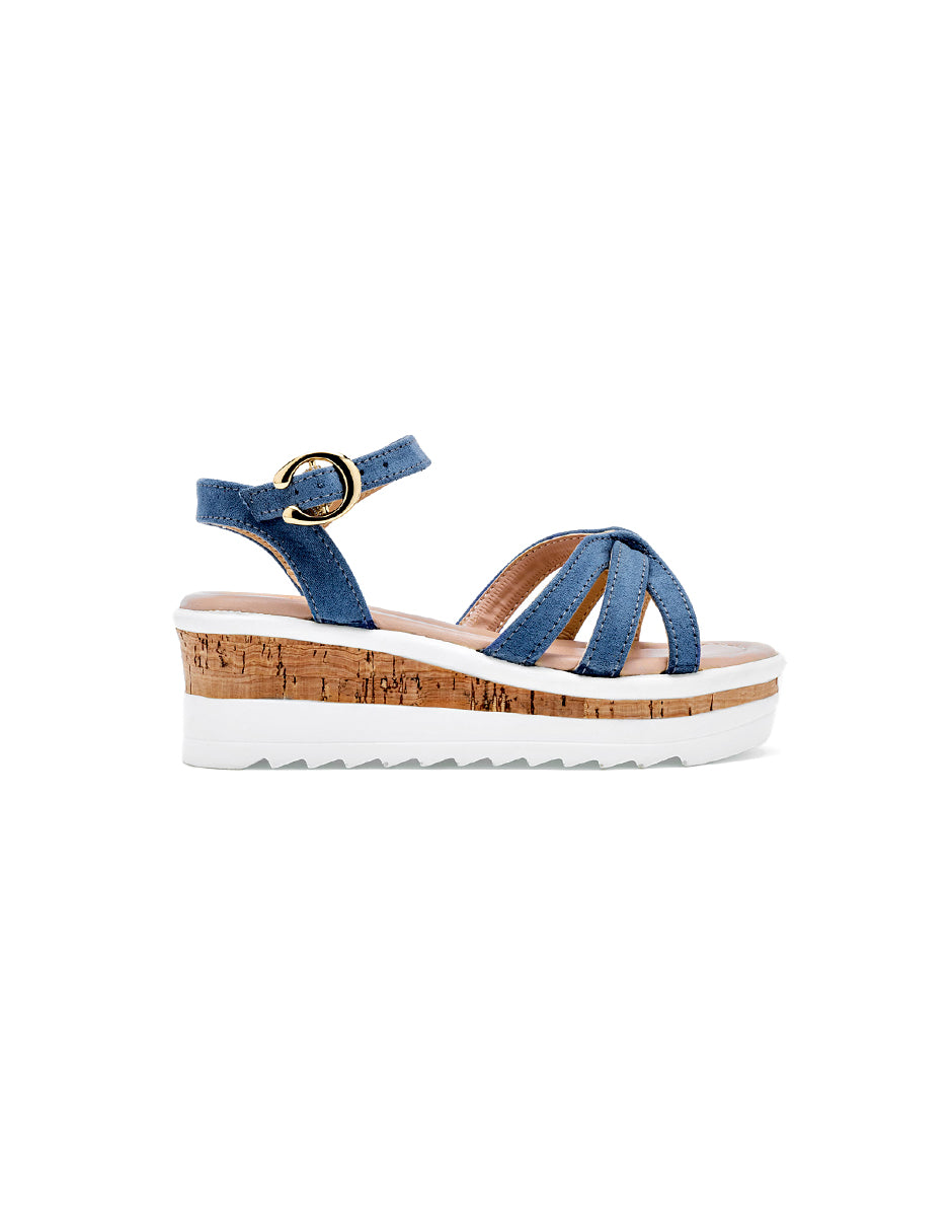 Sandalia color azul exterior textil, ajuste con hebilla, construcción vegano