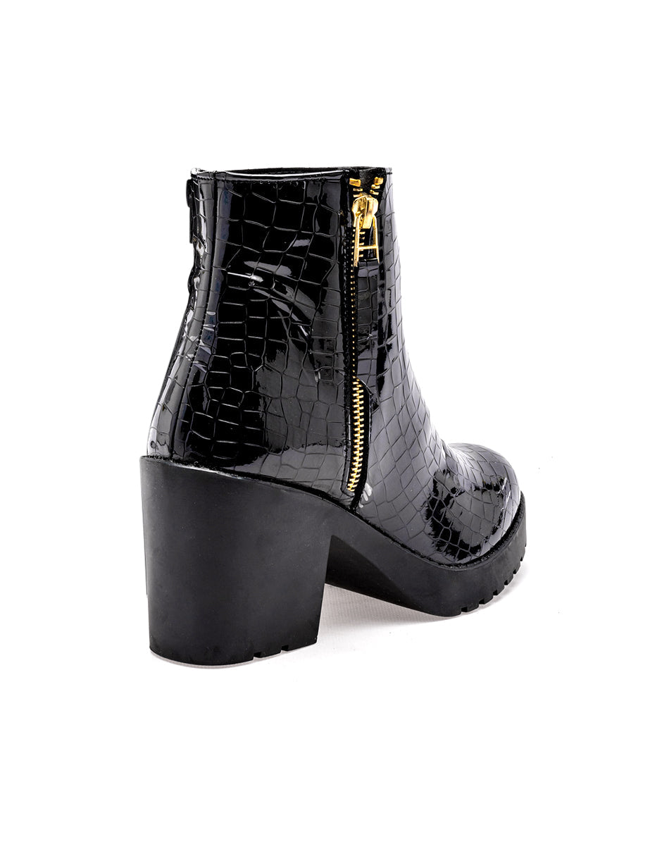 Botín con tacón color negro exterior textil, ajuste con cierre, construcción vegano