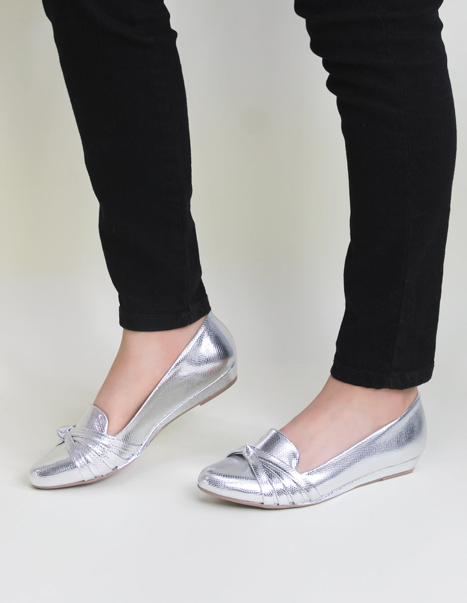 Añade un toque de brillo a tu día con estas flats de punta cerrada en piel vegana color plata, modelo Glam de RBCOLLECTION. Su diseño elegante destaca por el detalle de nudos en la parte frontal, que aporta un estilo sofisticado y moderno. Fabricadas con materiales ligeros y una suela cómoda, estas flats son perfectas para largas jornadas. El acabado metálico en plata combina con una amplia variedad de looks, desde atuendos casuales hasta conjuntos más formales. Ideales para quienes buscan una mezcla de estilo y comodidad en su calzado.