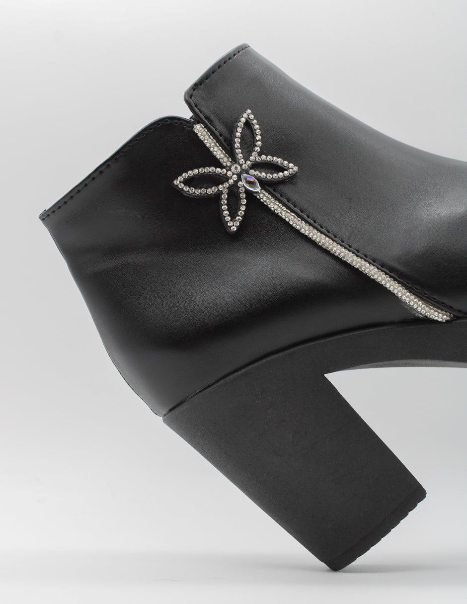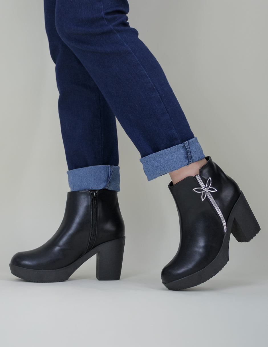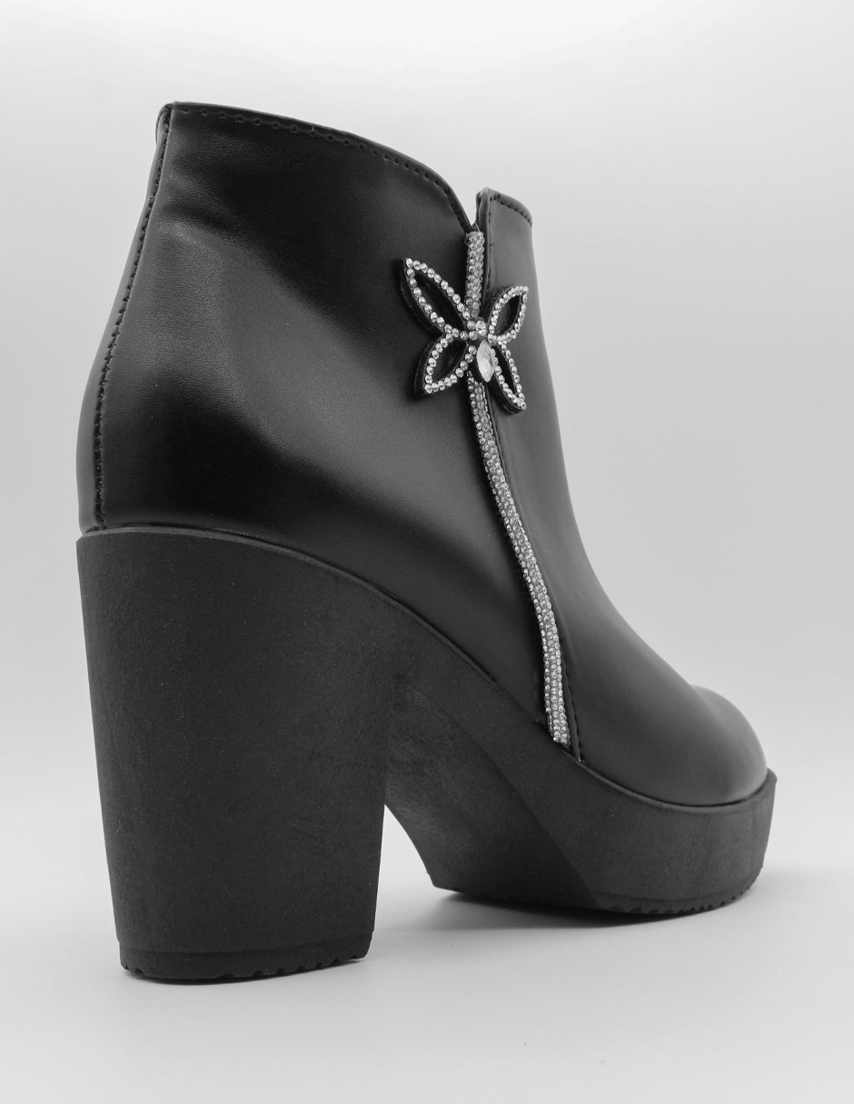 El botín con tacón para mujer de RBBASICS, modelo Noa, está confeccionado en piel vegana color negro, destacando por su elegancia y funcionalidad. Este diseño es ideal para complementar atuendos casuales o semiformales, ofreciendo un estilo versátil. Con un tacón grueso que proporciona estabilidad y comodidad, es perfecto para el uso diario. Un detalle decorativo en forma de flor metálica en el lateral añade un toque femenino y sofisticado. La suela robusta asegura excelente tracción en diversas superficies, mientras que el cierre lateral facilita su colocación. Estos botines representan una opción sostenible, perfecta para mujeres que buscan estilo, confort y distinción.