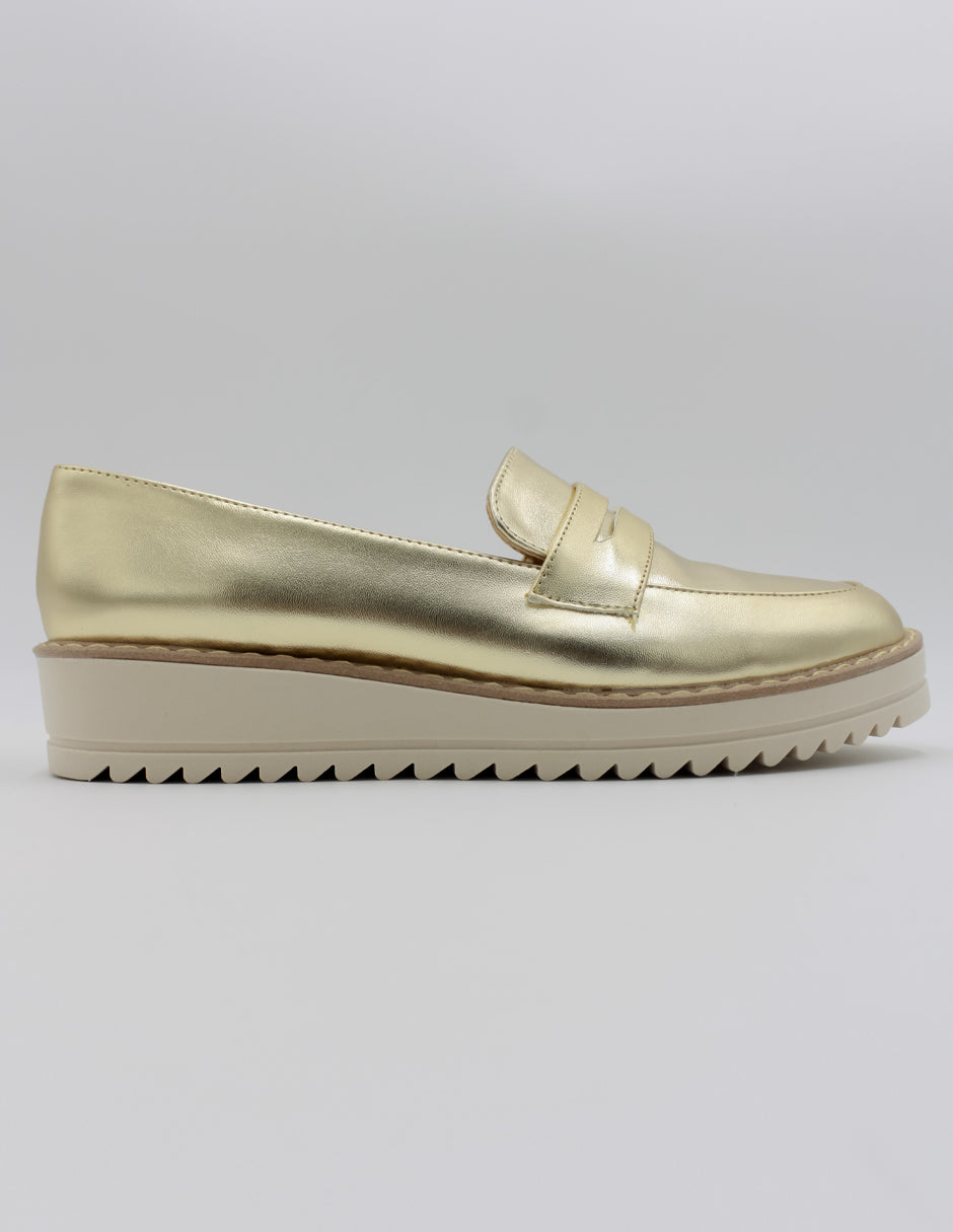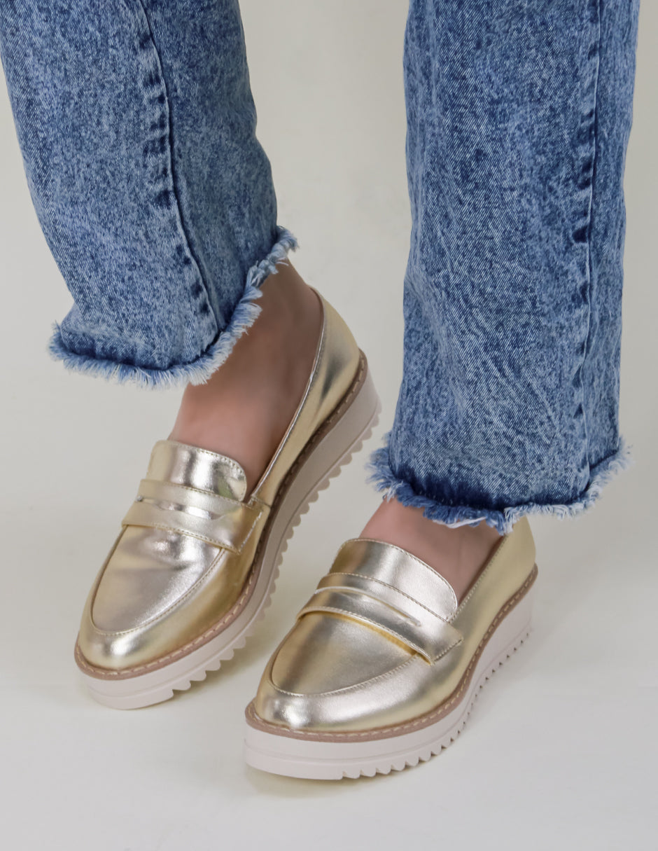 Mocasines para mujer de RBCOLLECTION, modelo Prim, confeccionados en piel vegana color Dorado. Este diseño destaca por su elegancia y comodidad, ideal para complementar cualquier atuendo. Su acabado metálico añade un toque moderno y sofisticado, mientras que la suela dentada proporciona estabilidad y un estilo contemporáneo. Con una construcción sin cordones, estos mocasines permiten un calce fácil y rápido, perfecto para el día a día. La plataforma sutil ofrece soporte adicional, haciendo de este modelo una opción práctica y versátil. Ideales para mujeres que buscan un calzado cómodo, ético y con un diseño que equilibra funcionalidad y estilo.