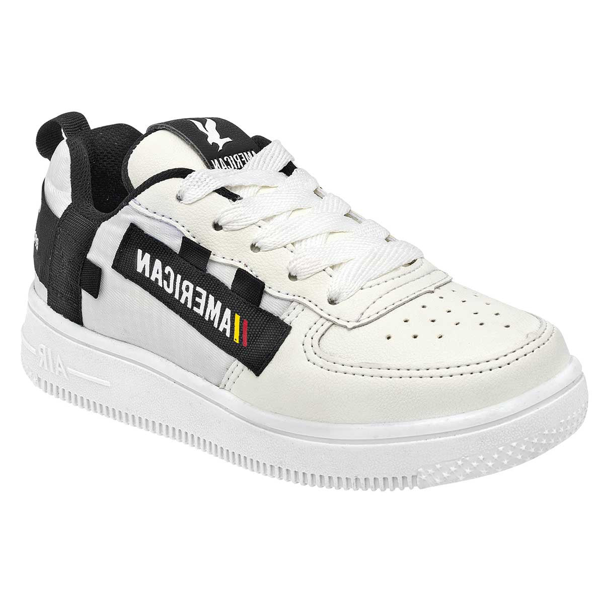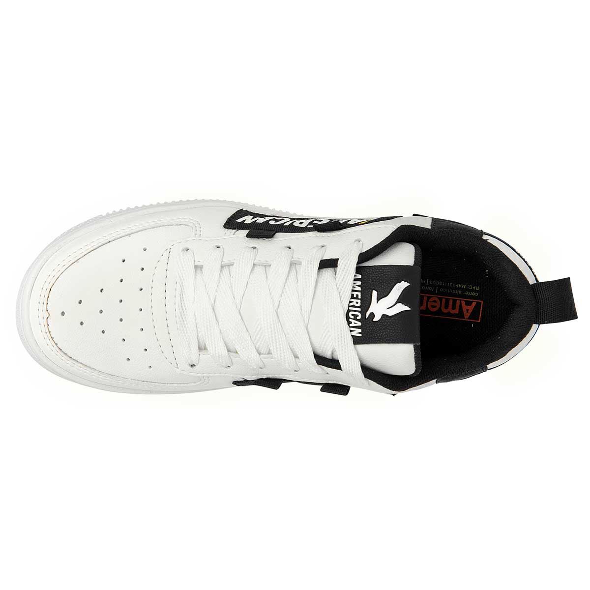 Tenis con cordones color blanco negro exterior sintético, ajuste con agujeta, construcción vegano