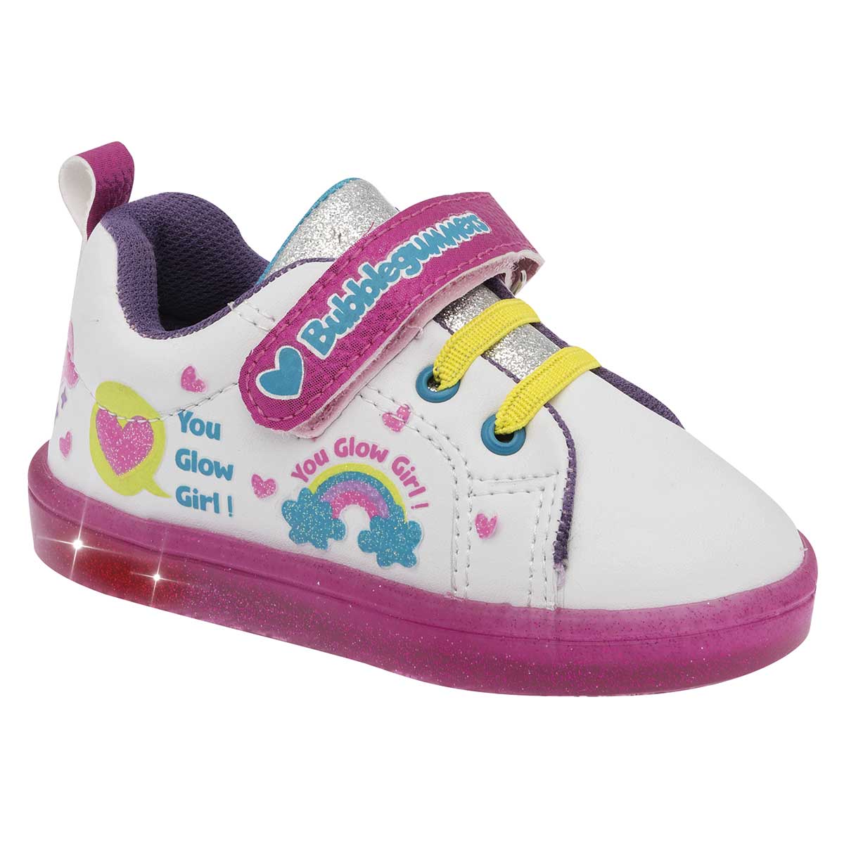 Detalle especial: Arcoiris a un costado con corazones suela color rosa con agujeta amarilla