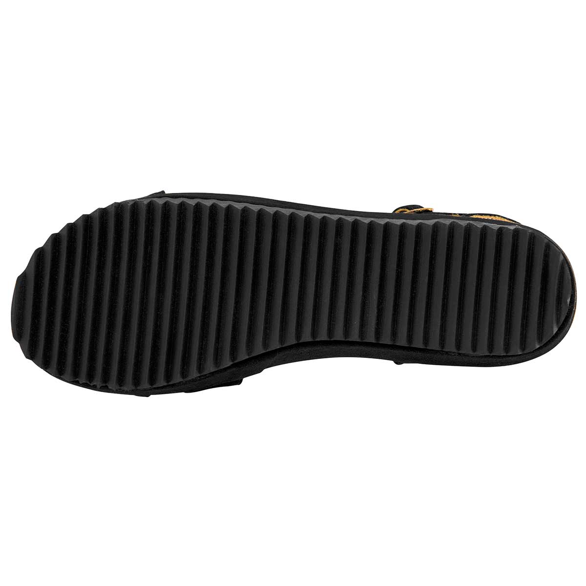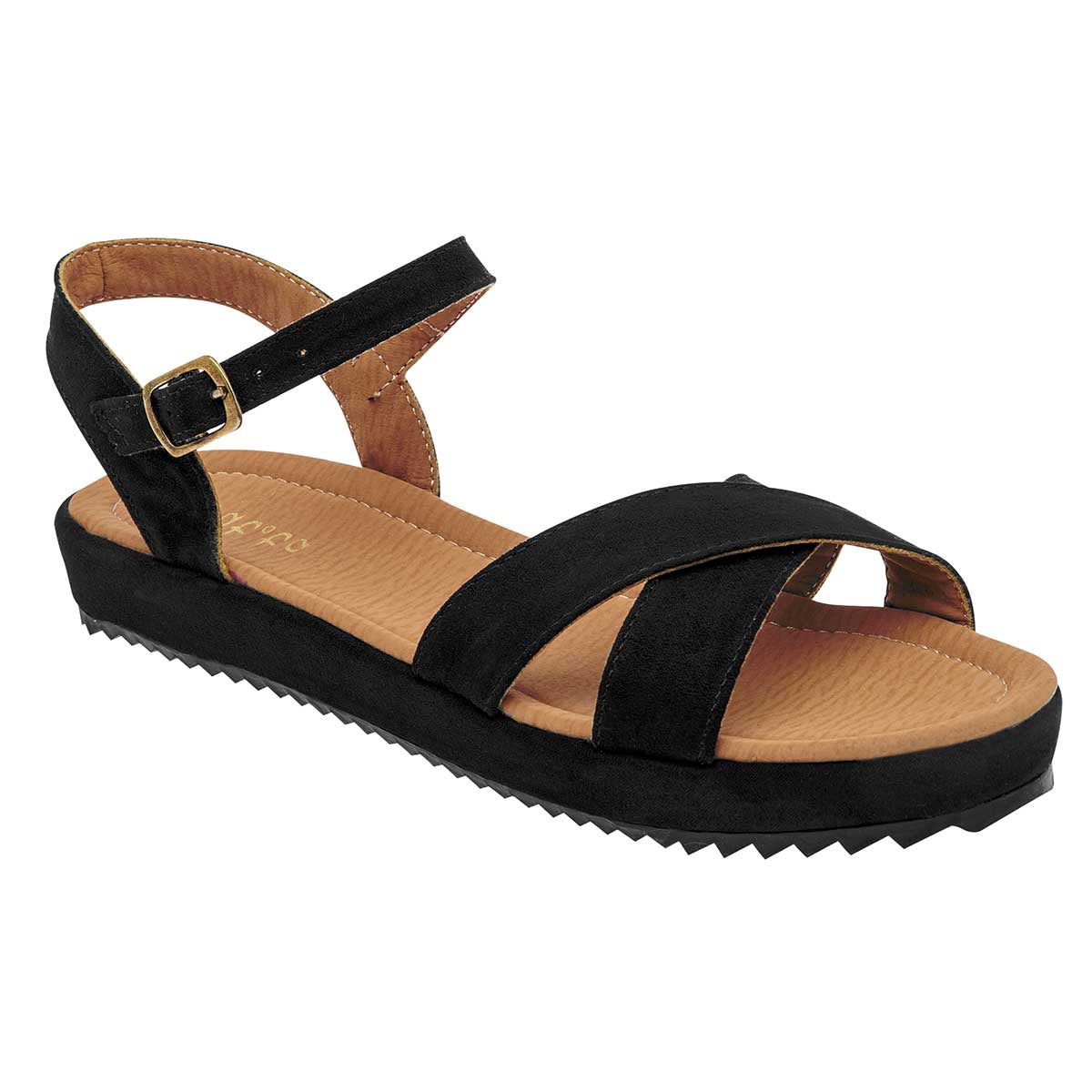 Sandalias de piso color negro exterior textil, ajuste con hebilla, construcción vegano