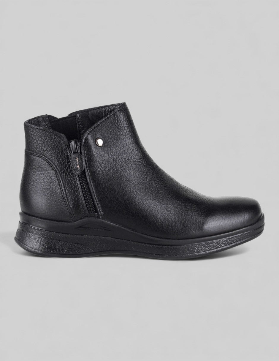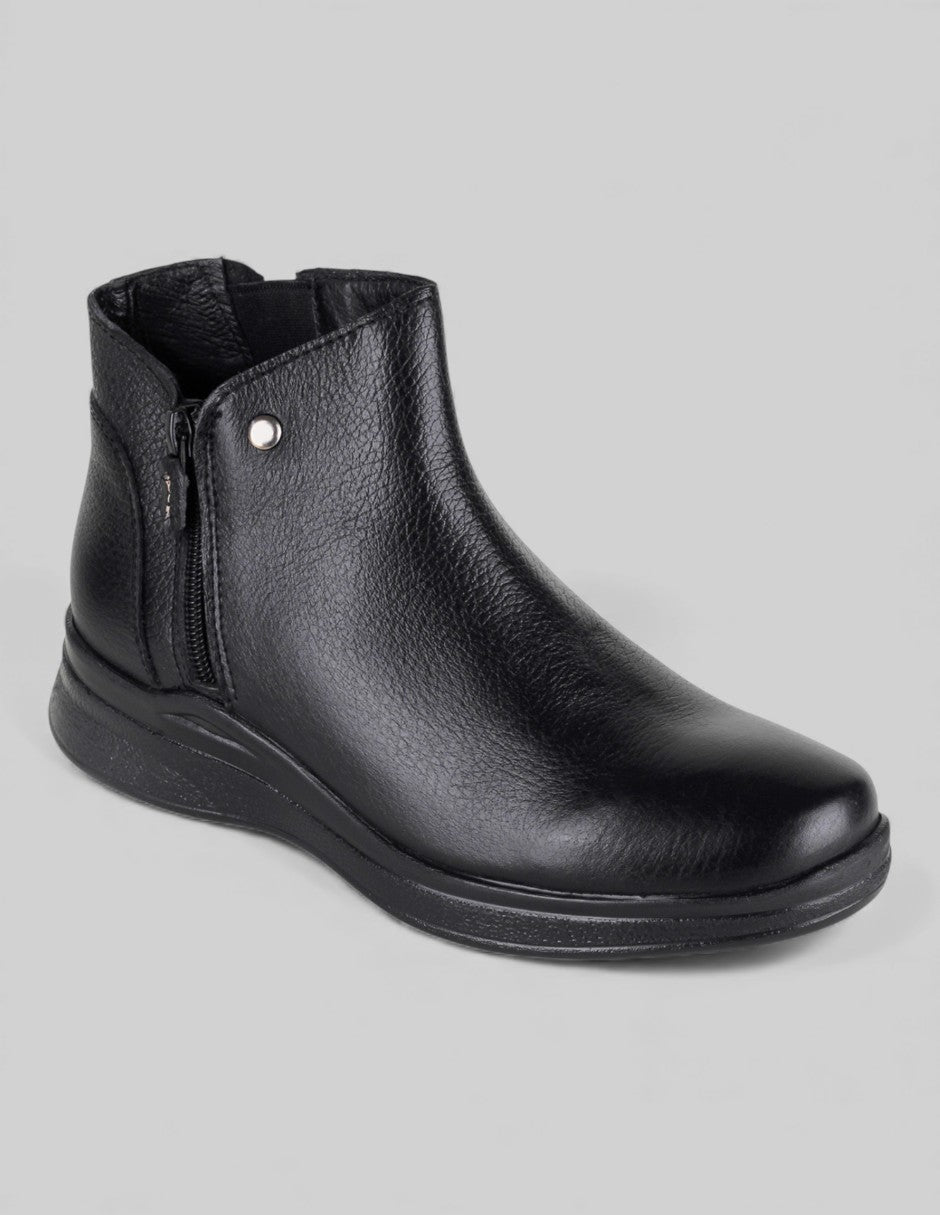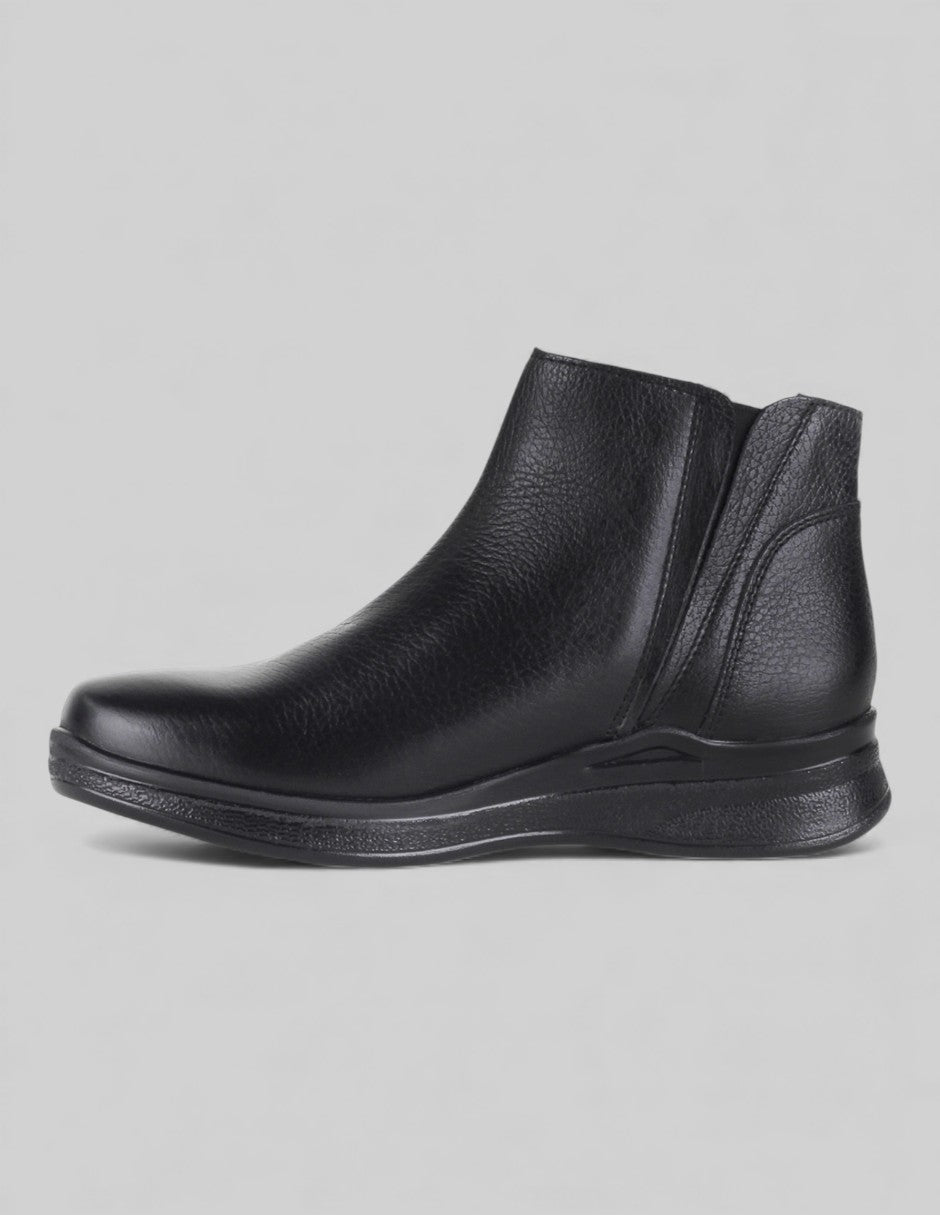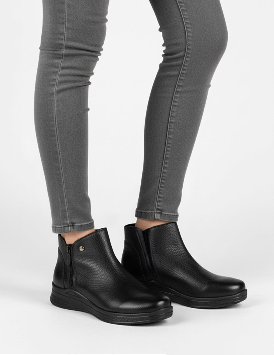 El botín con cuña modelo Hand Made de RBCOLLECTION en piel color negro combina sencillez moderna y comodidad duradera. Su cierre lateral funcional aporta practicidad al uso diario, ideal para caminar con estilo y confianza. ¡Ordénalo hoy y añade un toque versátil a tu guardarropa urbano!