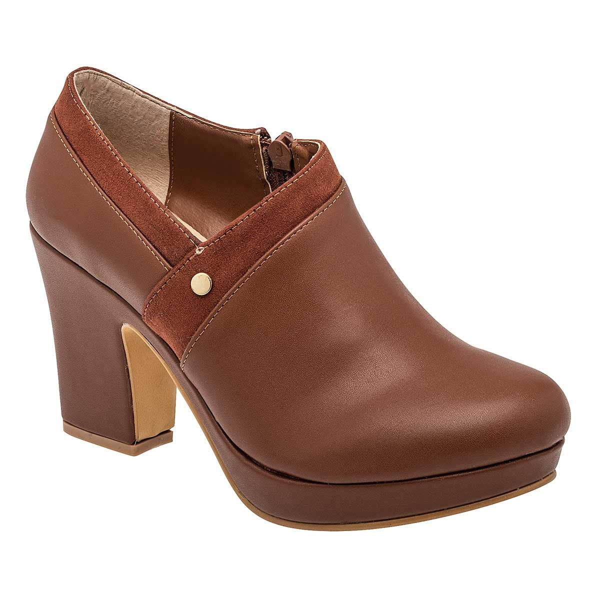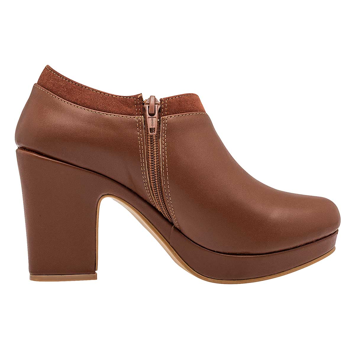 Botín con tacón color camel exterior sintético, ajuste con cierre, construcción vegano