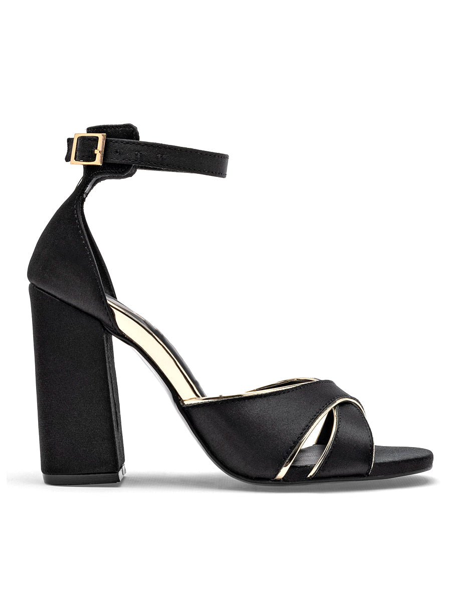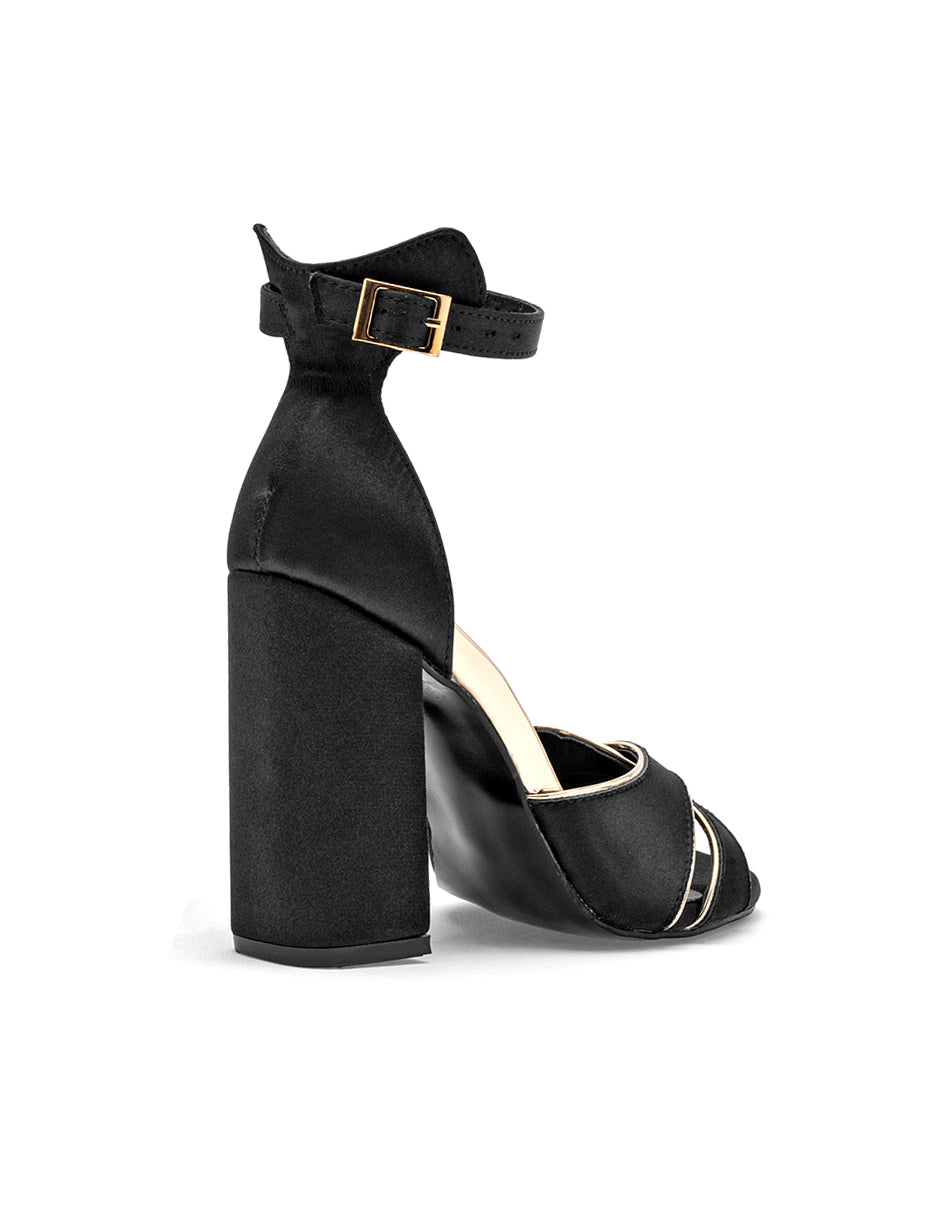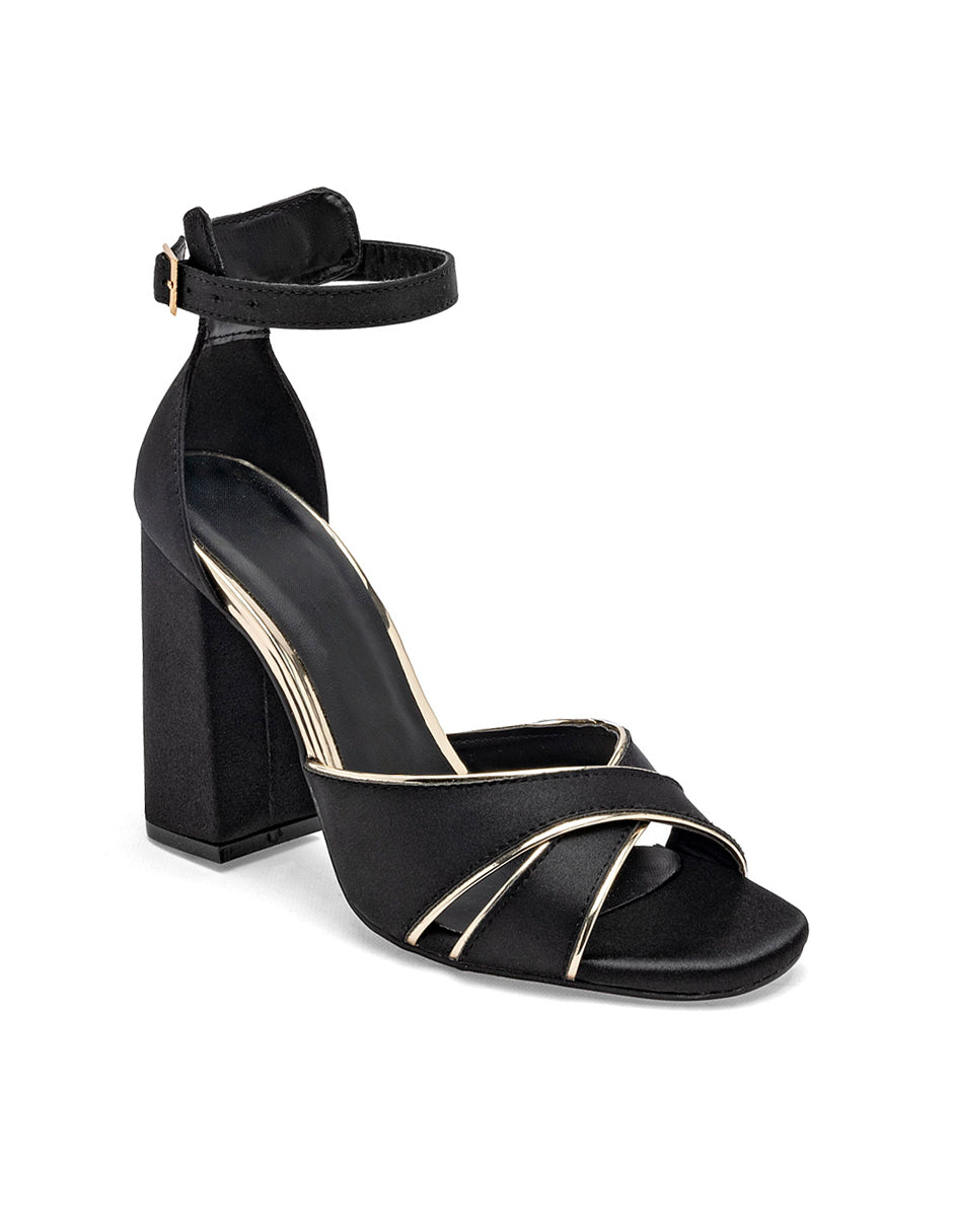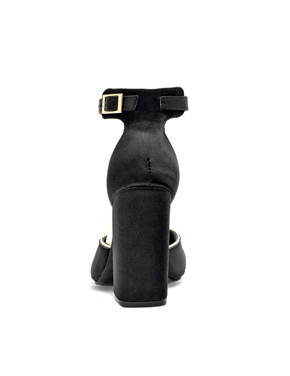 Sandalia con tacón color negro exterior textil, ajuste con pulsera, construcción vegano