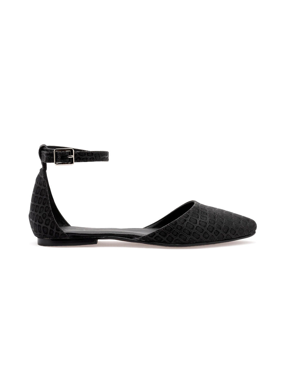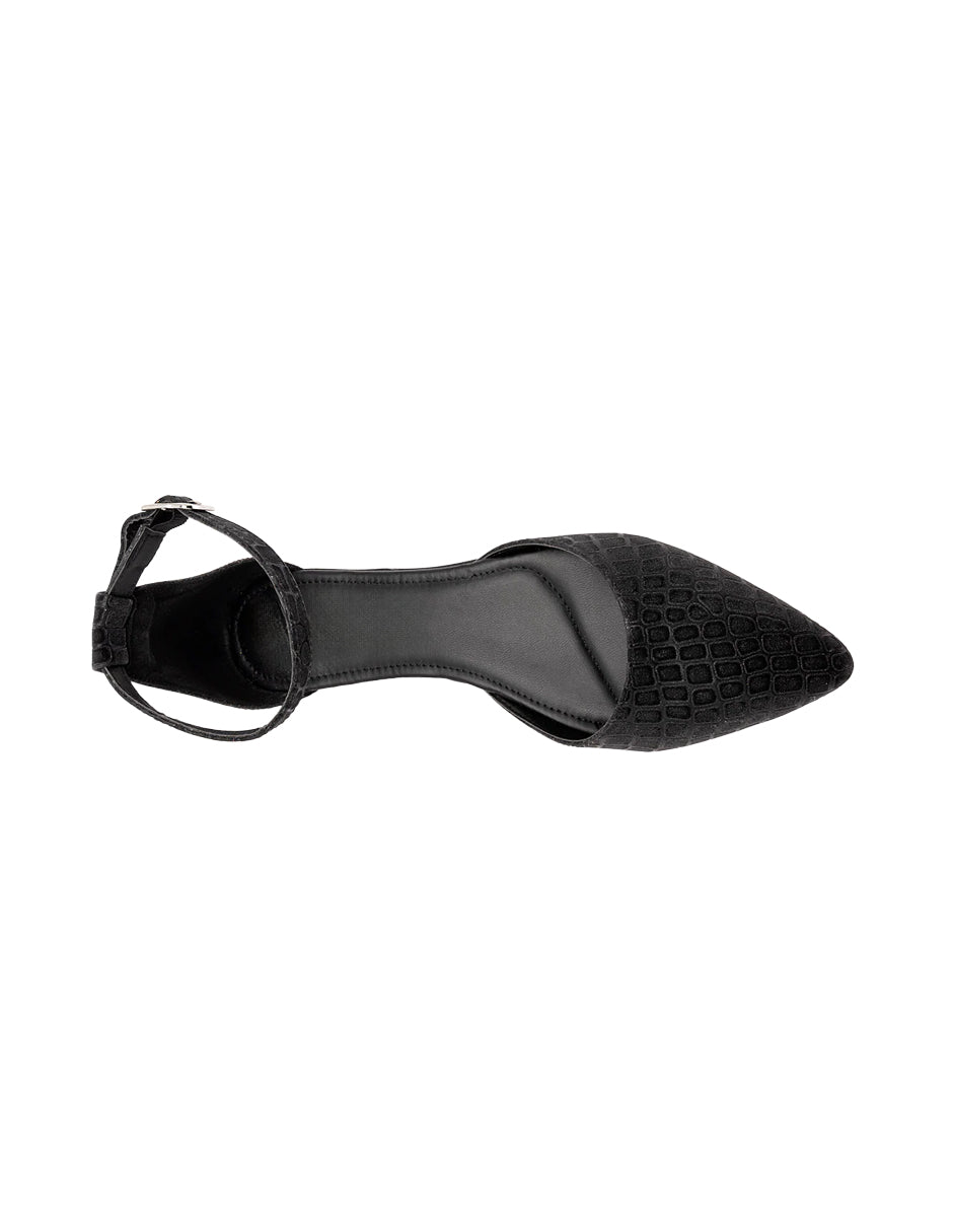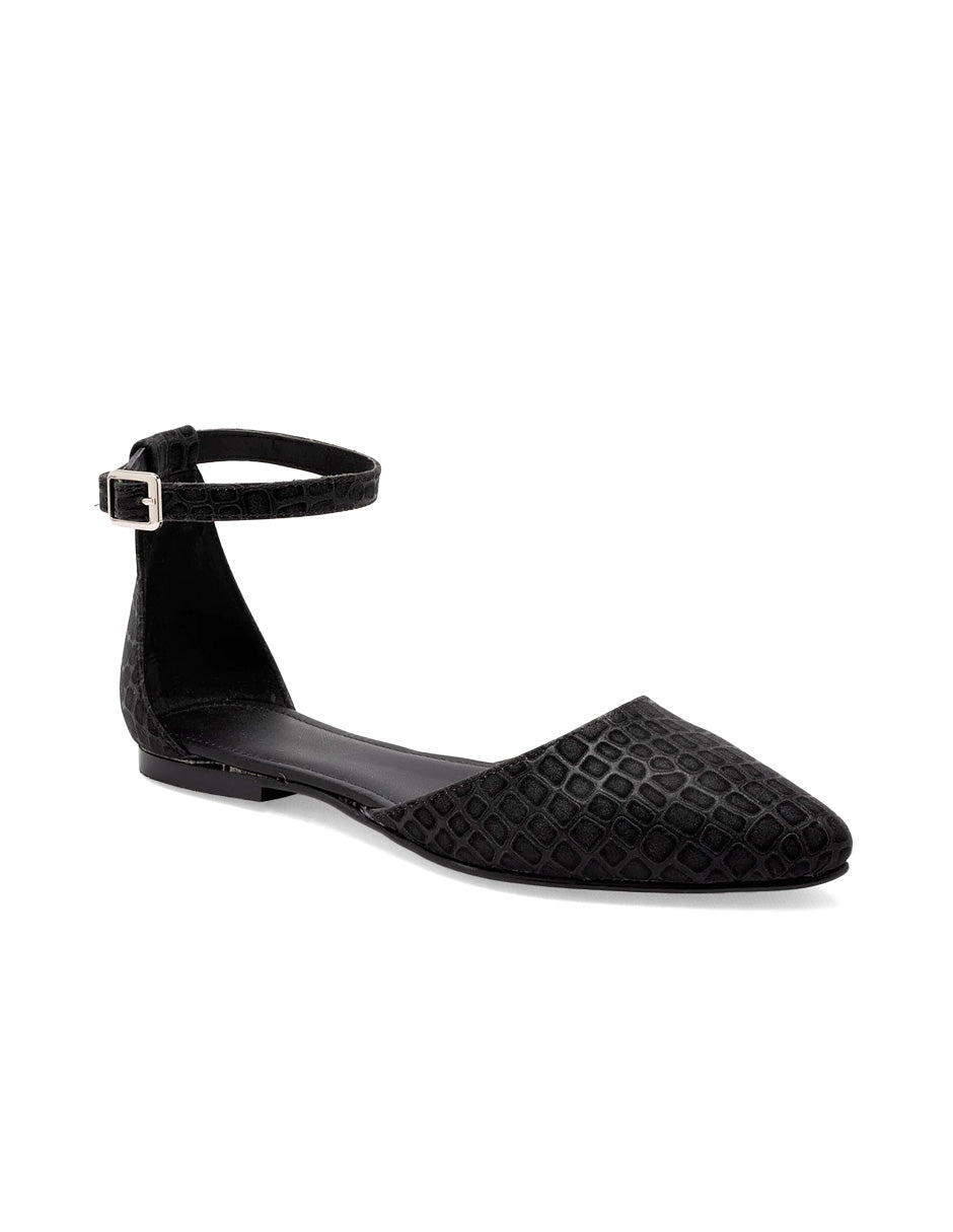Flats puntales color negro exterior sintético, ajuste con hebilla, construcción vegano
