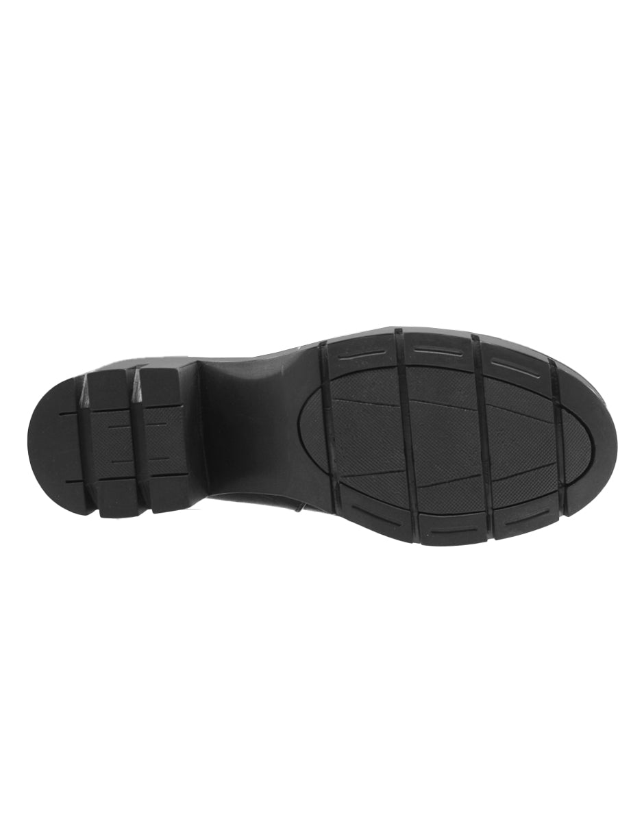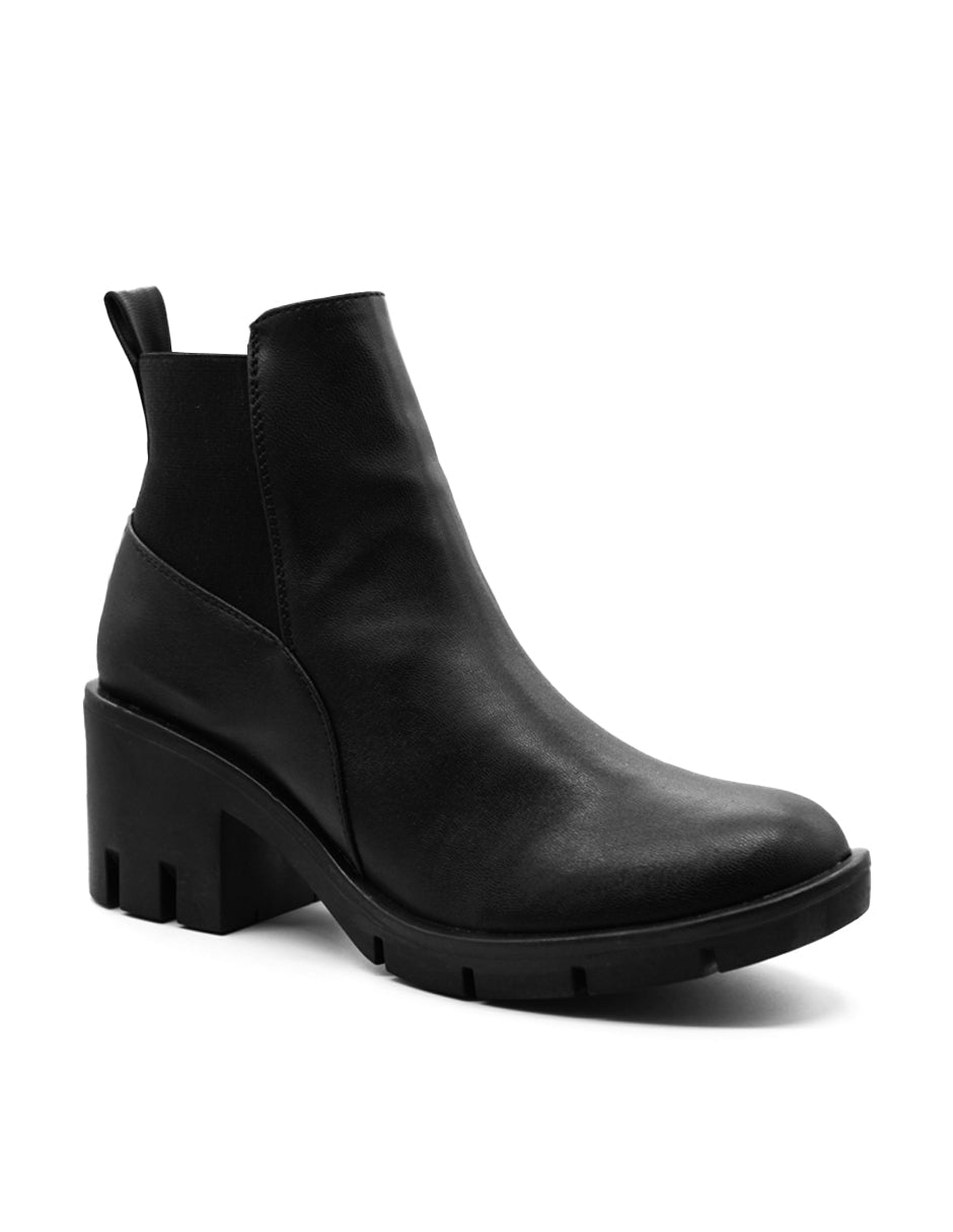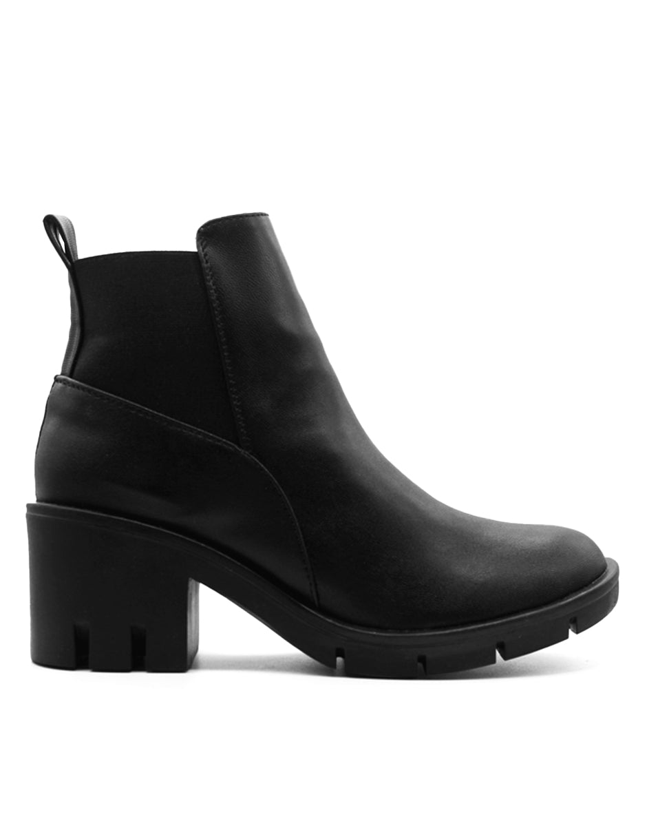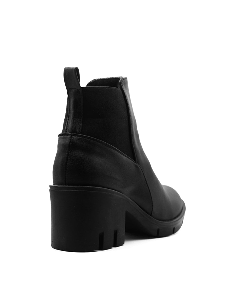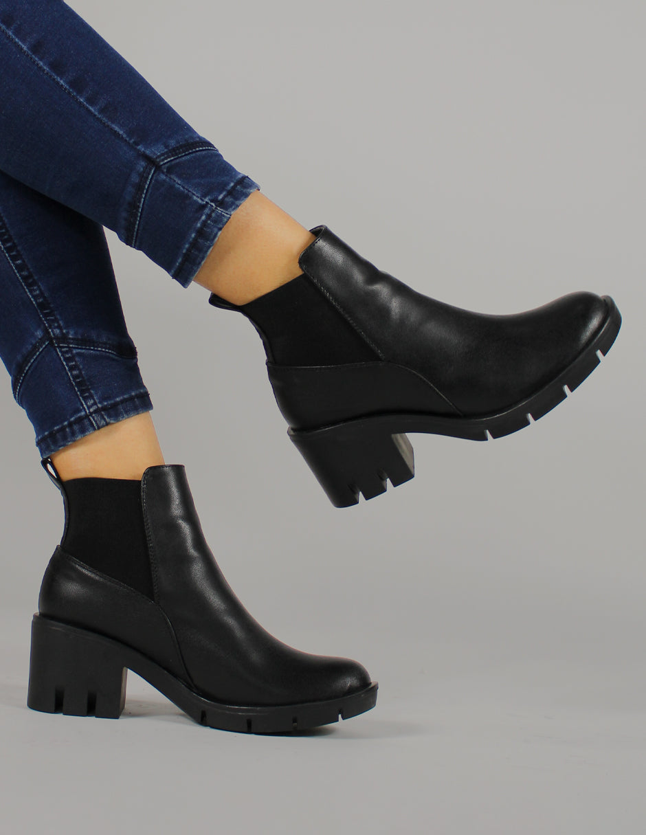 Botín con tacón color negro exterior piel sintética, ajuste con 1 tiempo, construcción vegano