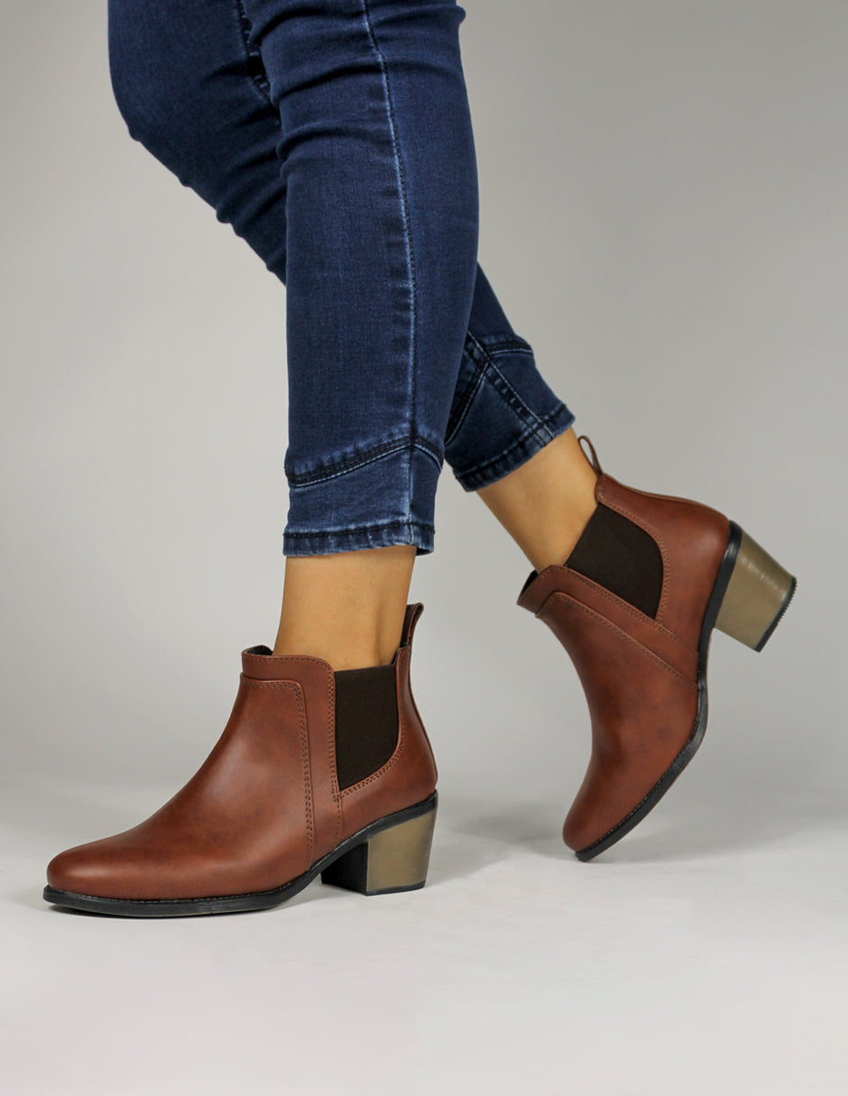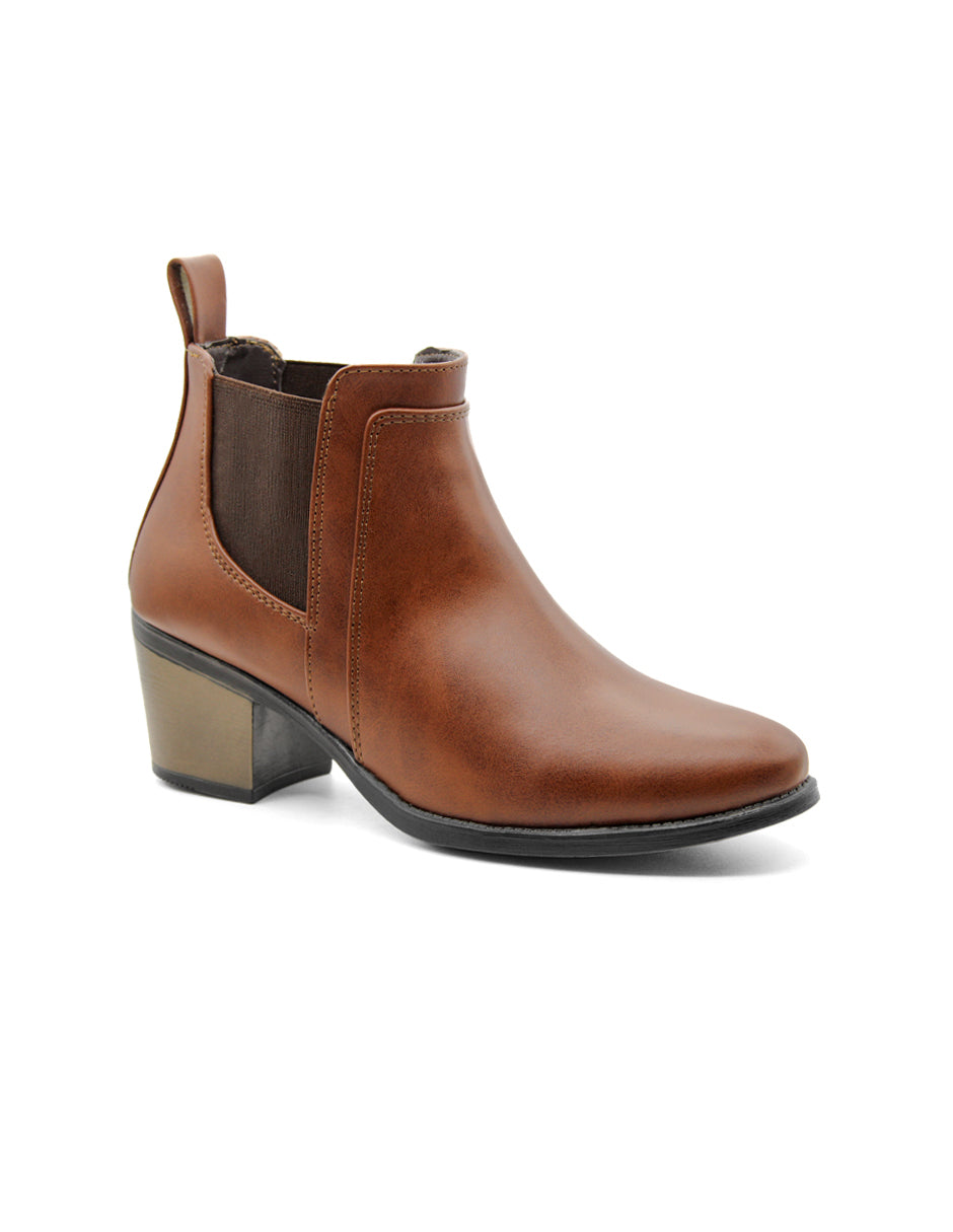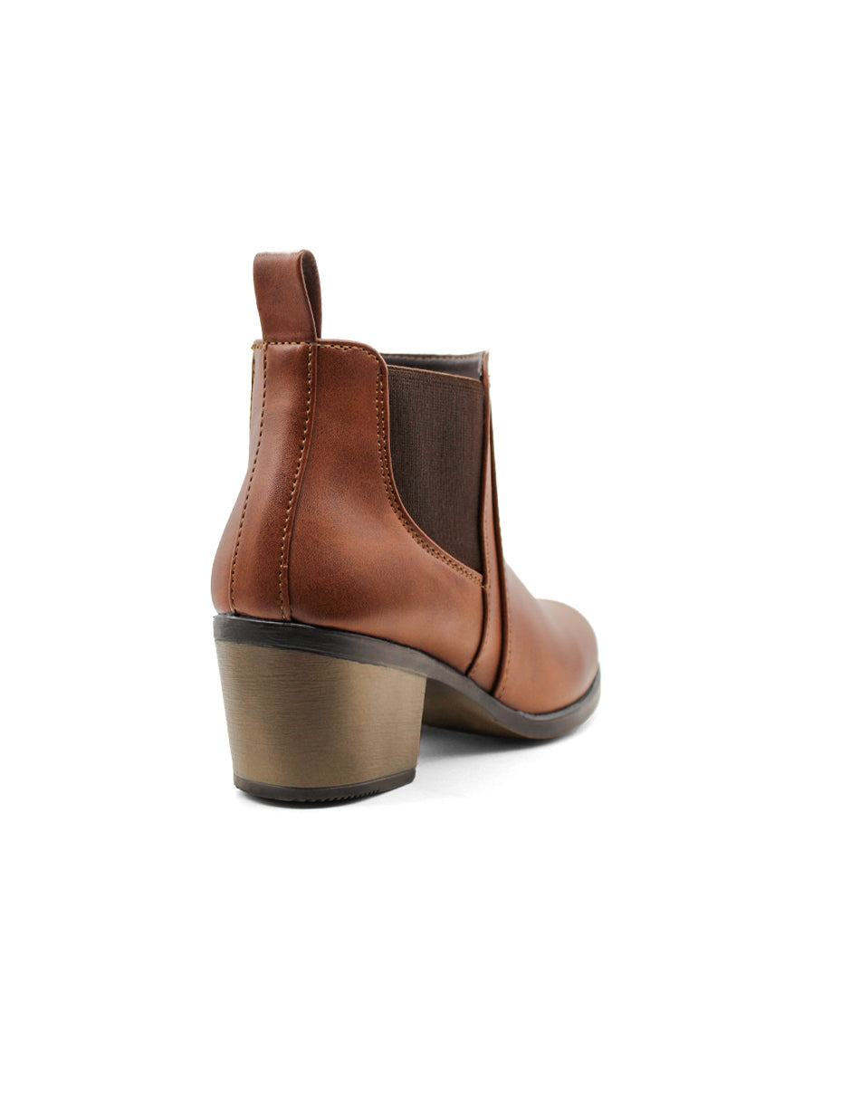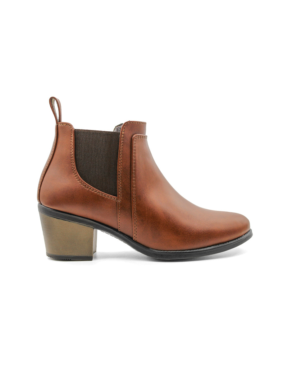 Botín con tacón color café exterior piel sintética, ajuste con 1 tiempo, construcción vegano