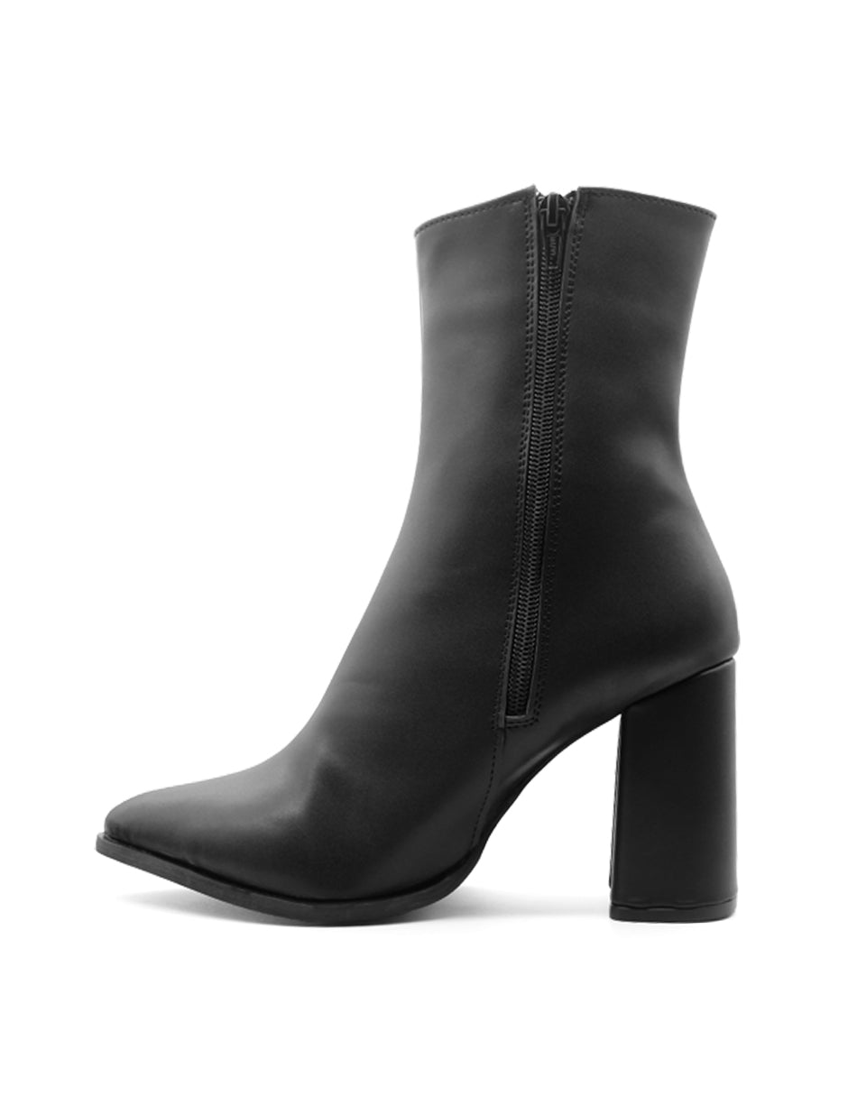 Botín con tacón color negro exterior sintético, ajuste con cierre, construcción vegano