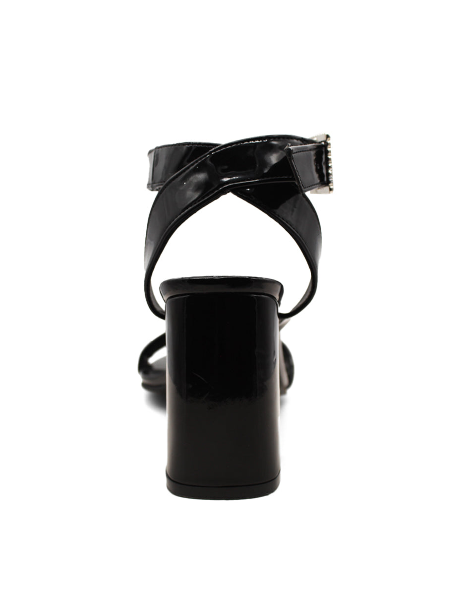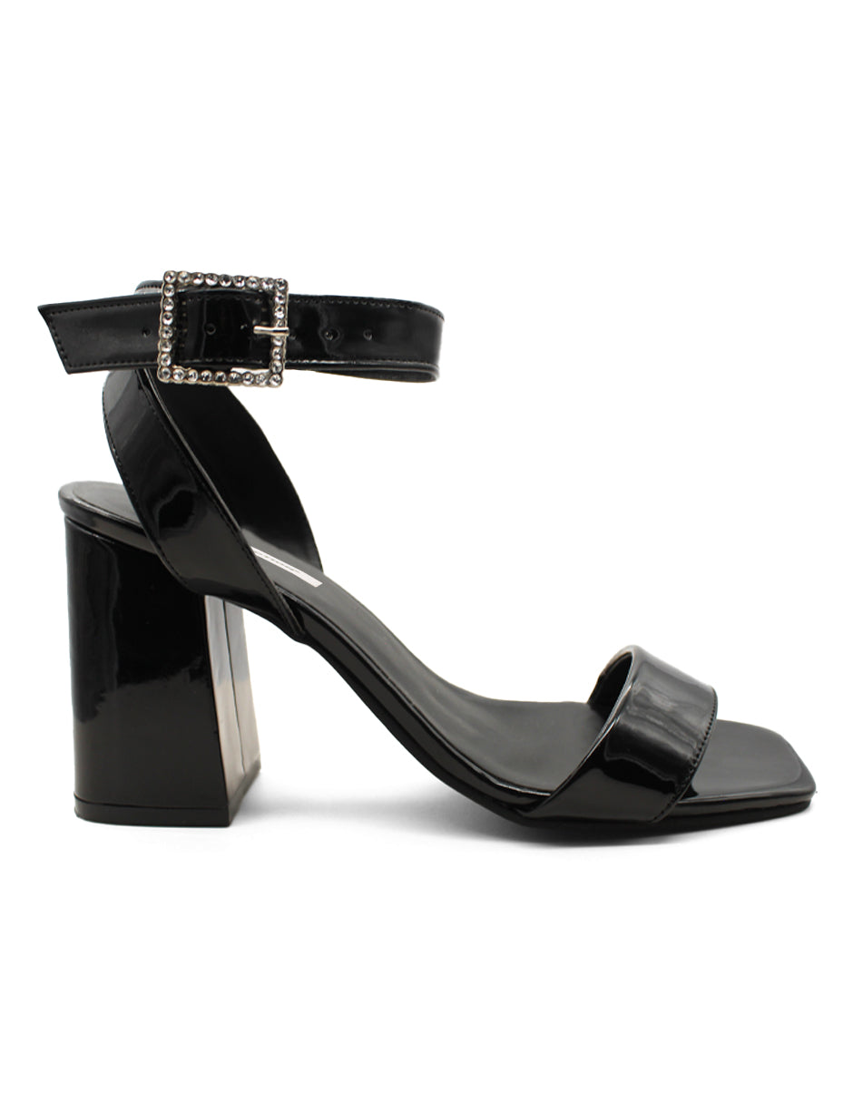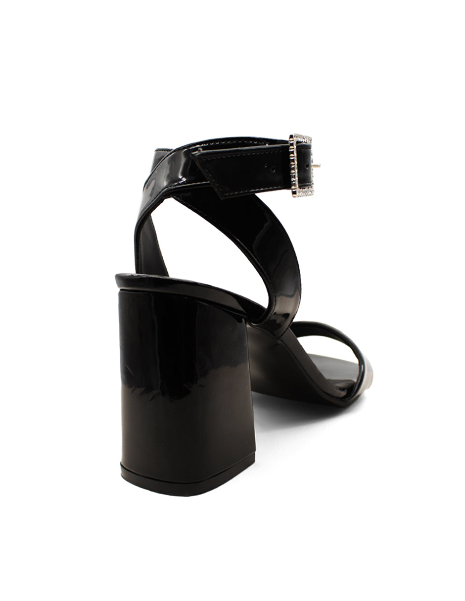 Sandalia con tacón color negro exterior charol, ajuste con hebilla, construcción vegano