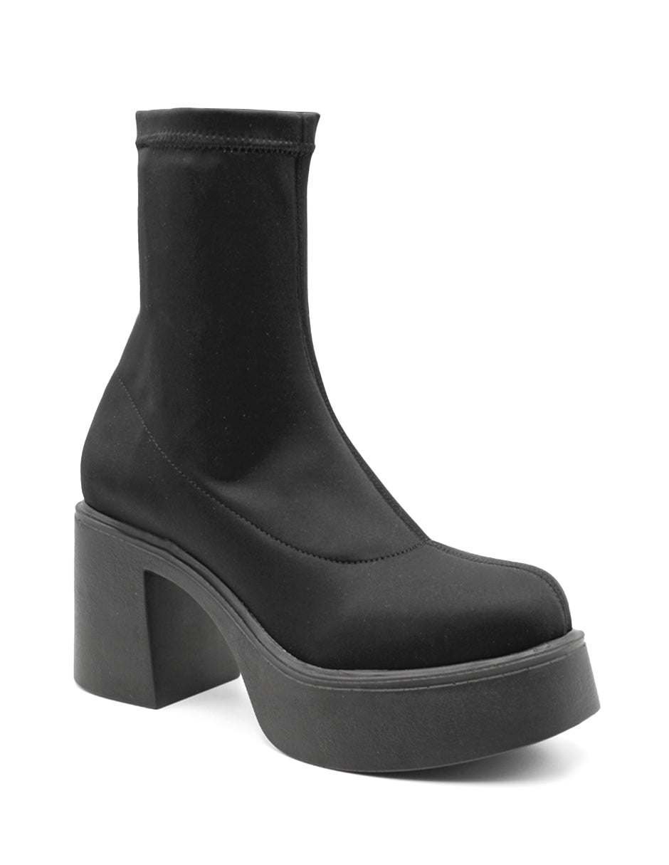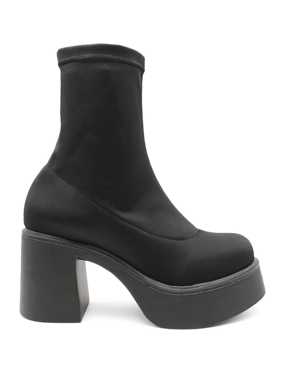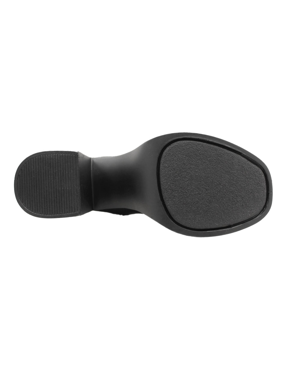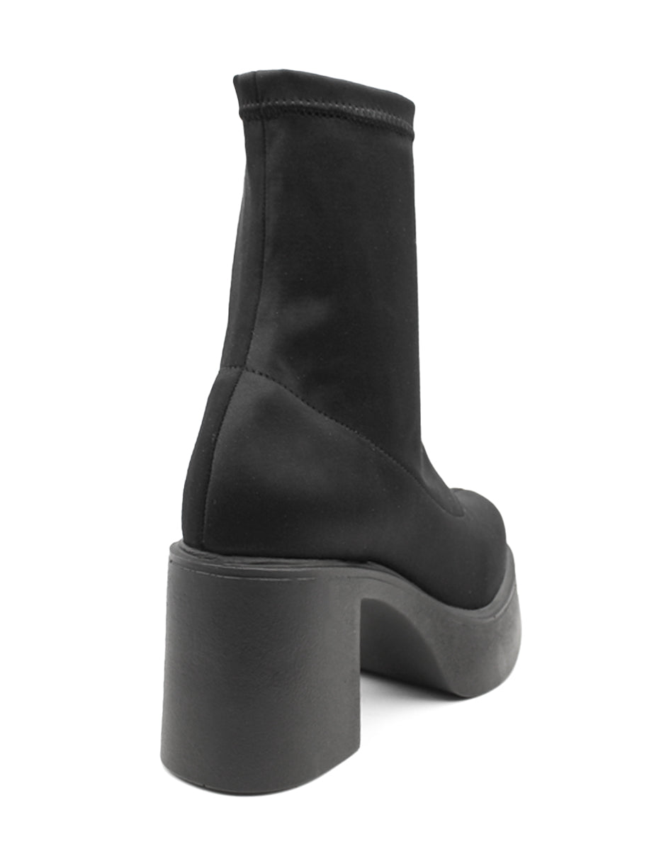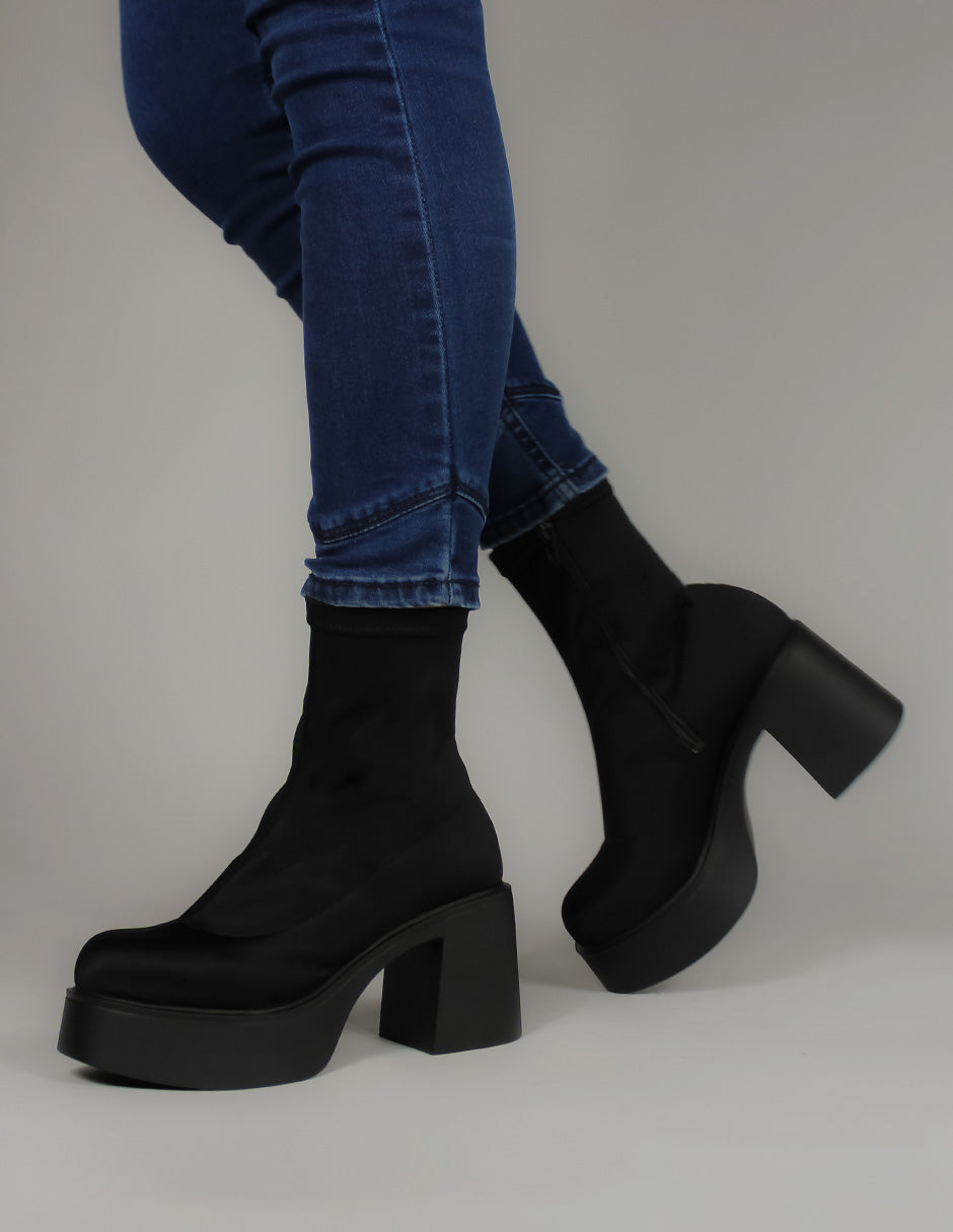 Botín con tacón color negro exterior textil, ajuste con cierre, construcción vegano