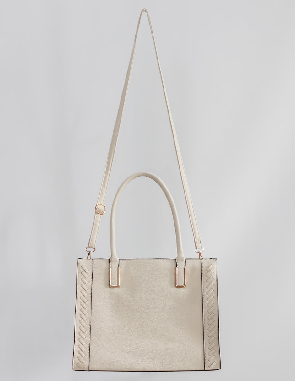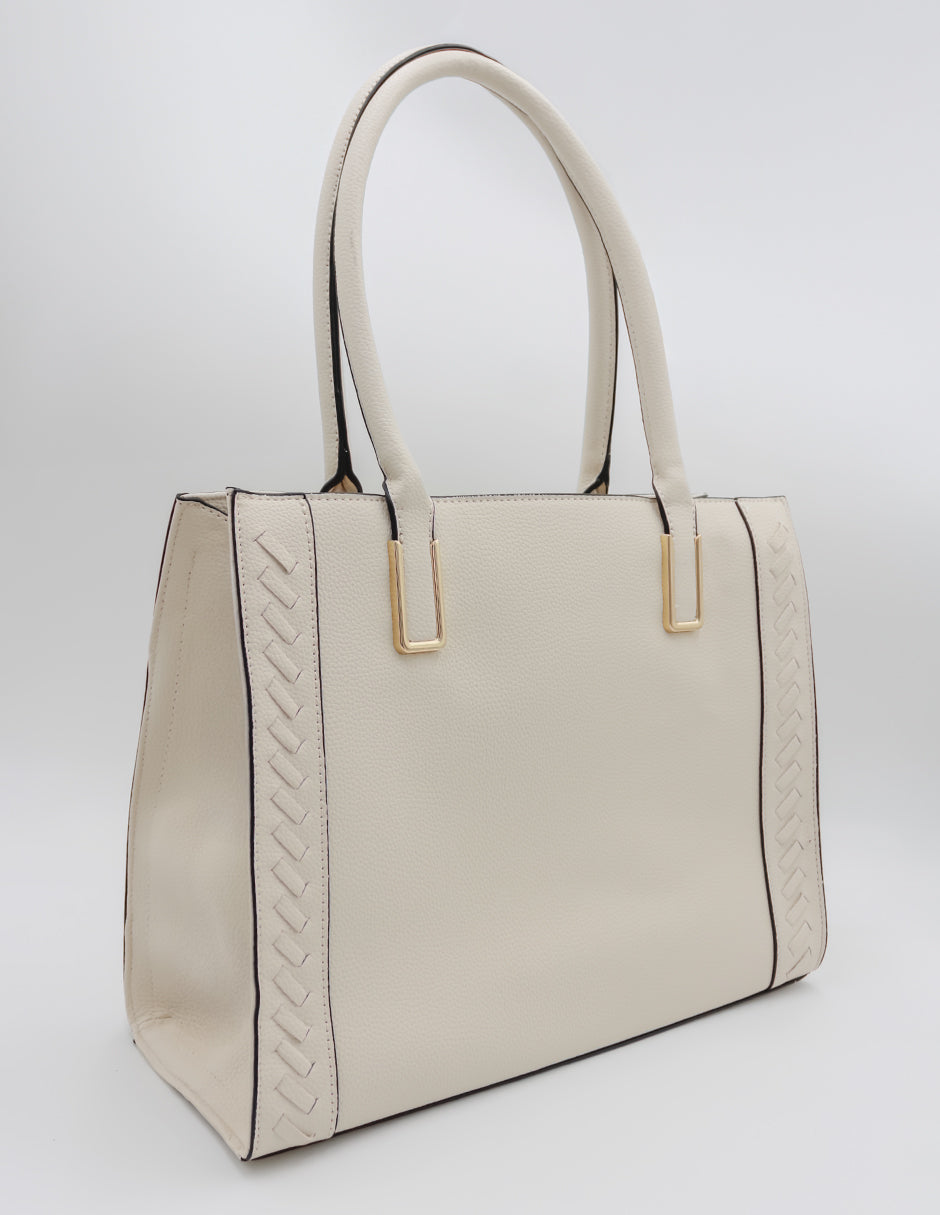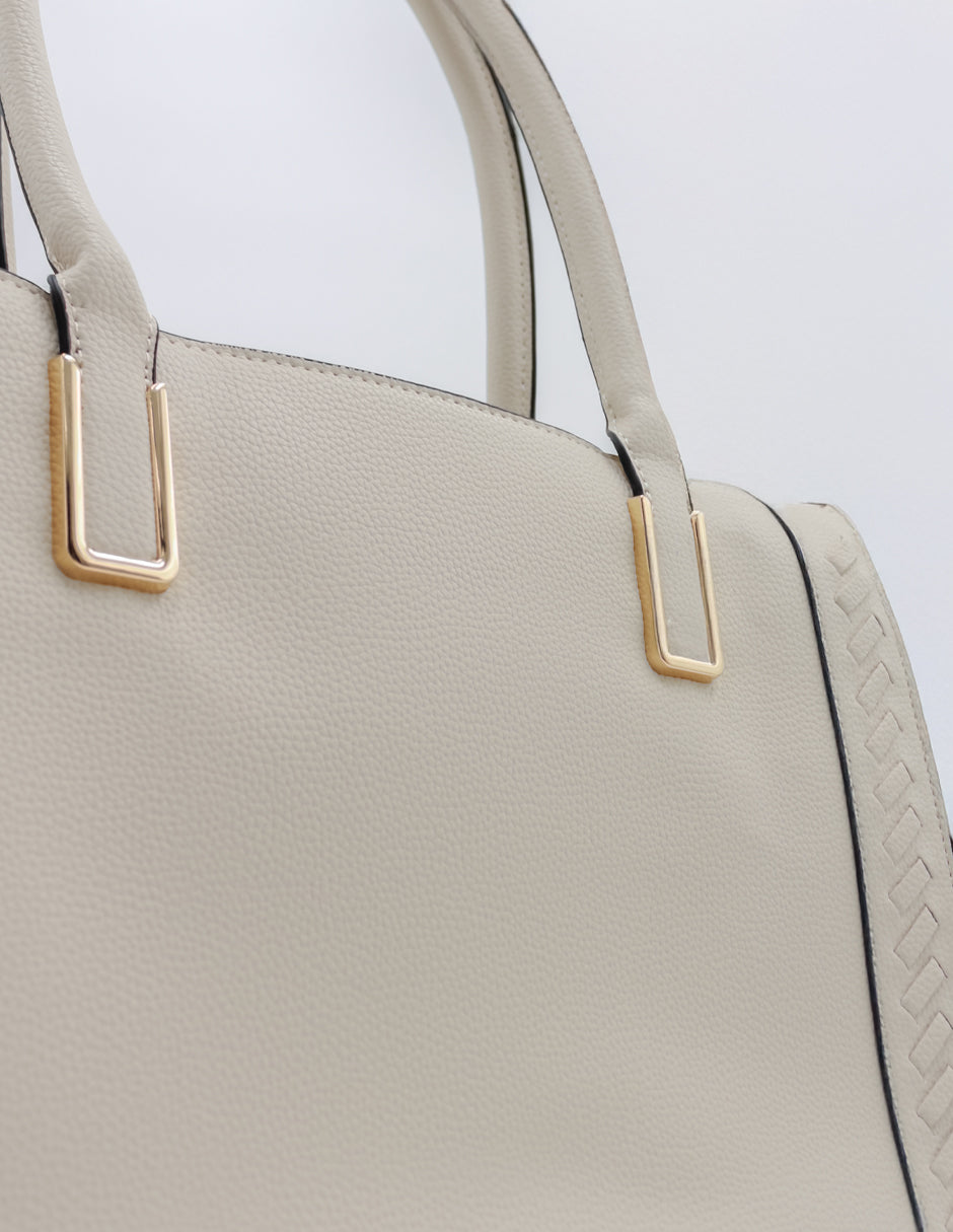 Bolsa Satchel para mujer de RBCOLLECTION, modelo Millá, elaborada en piel vegana color Beige. Este diseño sofisticado y funcional cuenta con un amplio compartimento principal, ideal para organizar tus pertenencias con comodidad. Sus asas reforzadas ofrecen un agarre seguro y cómodo, mientras que el acabado en piel vegana refleja elegancia y compromiso sostenible. Detalles metálicos dorados añaden un toque moderno y distinguido. Incluye una bolsa interior removible que aporta versatilidad, perfecta para el día a día o eventos especiales. Su tonalidad negra la convierte en una opción fácil de combinar, ideal para mujeres que buscan estilo y practicidad.