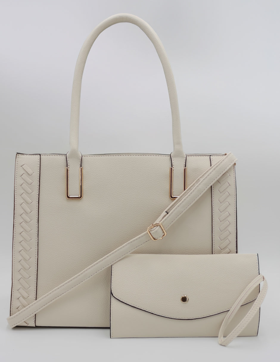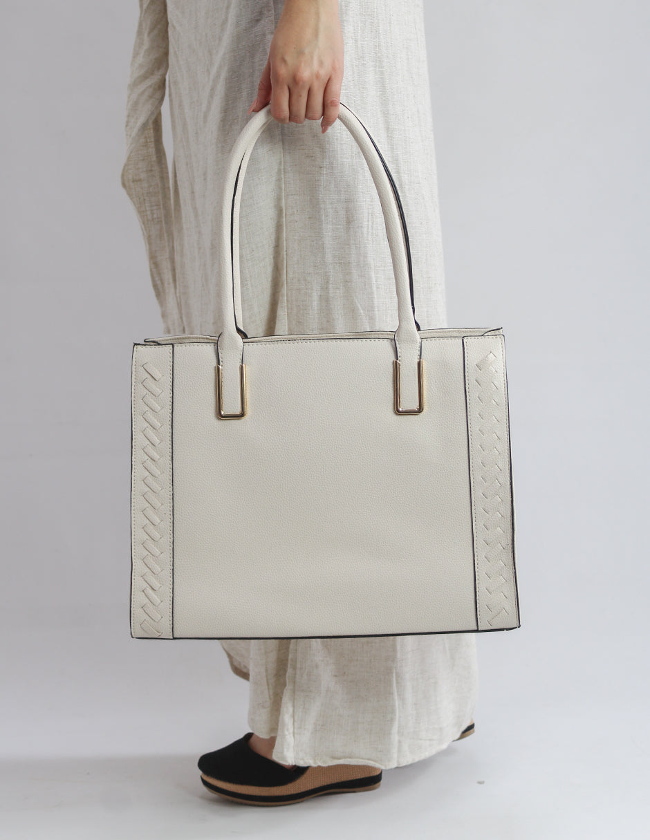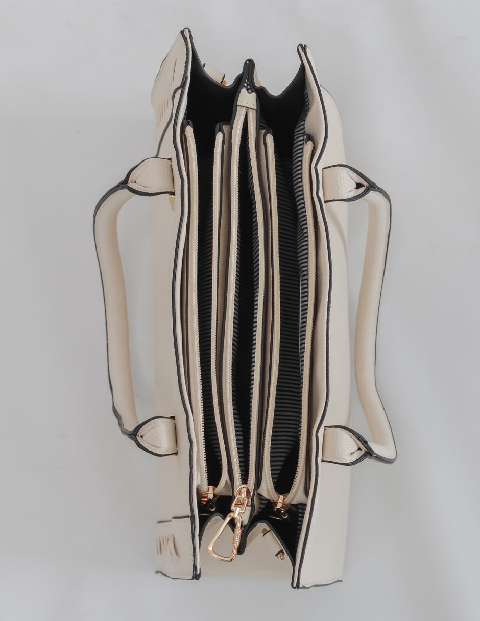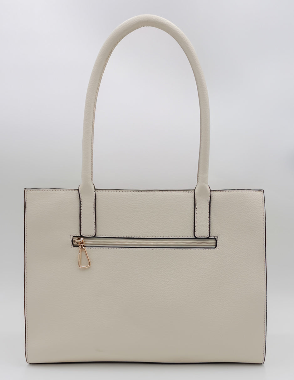 Bolsa Satchel para mujer de RBCOLLECTION, modelo Millá, elaborada en piel vegana color Beige. Este diseño sofisticado y funcional cuenta con un amplio compartimento principal, ideal para organizar tus pertenencias con comodidad. Sus asas reforzadas ofrecen un agarre seguro y cómodo, mientras que el acabado en piel vegana refleja elegancia y compromiso sostenible. Detalles metálicos dorados añaden un toque moderno y distinguido. Incluye una bolsa interior removible que aporta versatilidad, perfecta para el día a día o eventos especiales. Su tonalidad negra la convierte en una opción fácil de combinar, ideal para mujeres que buscan estilo y practicidad.