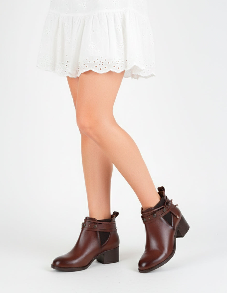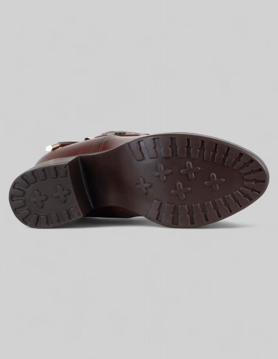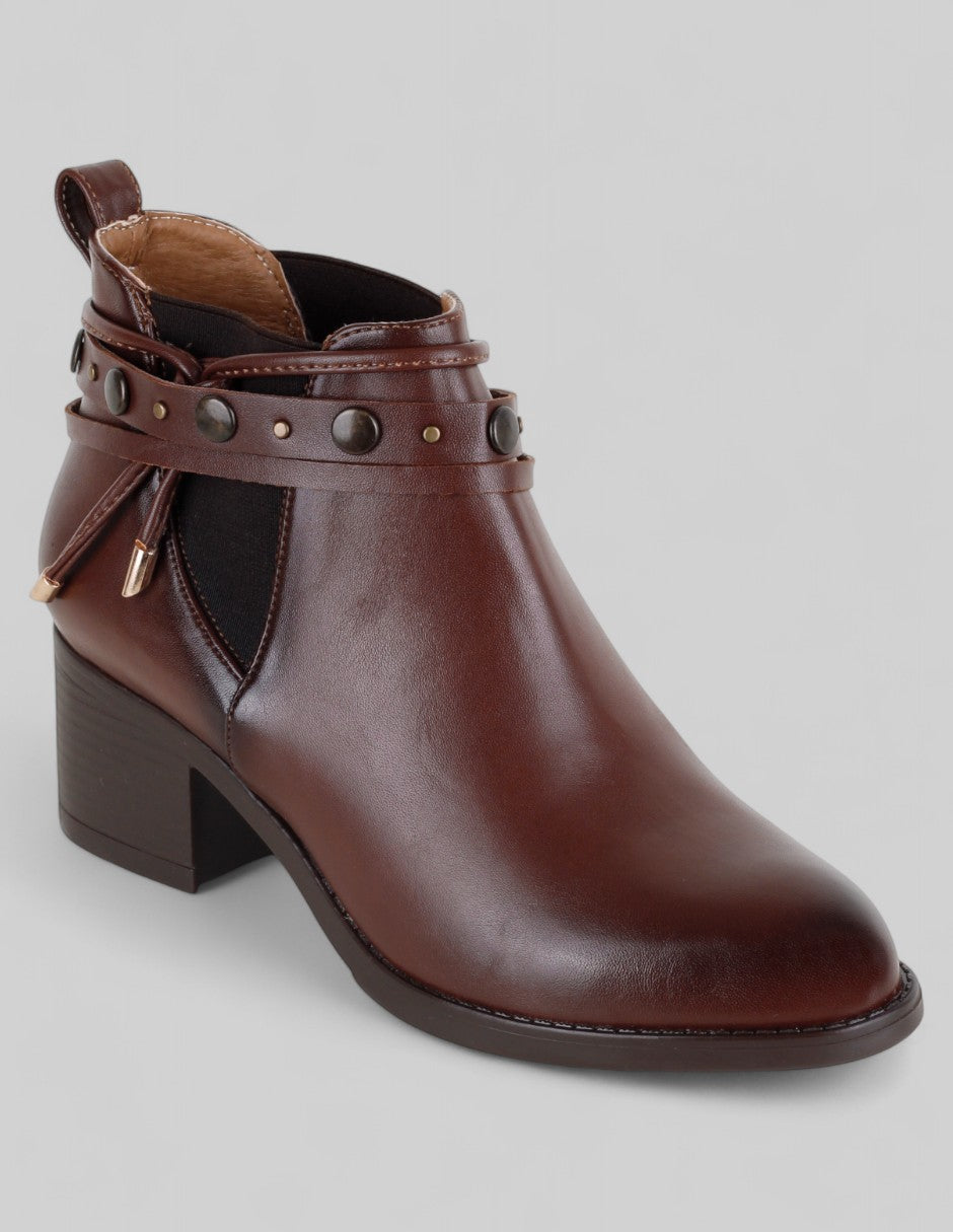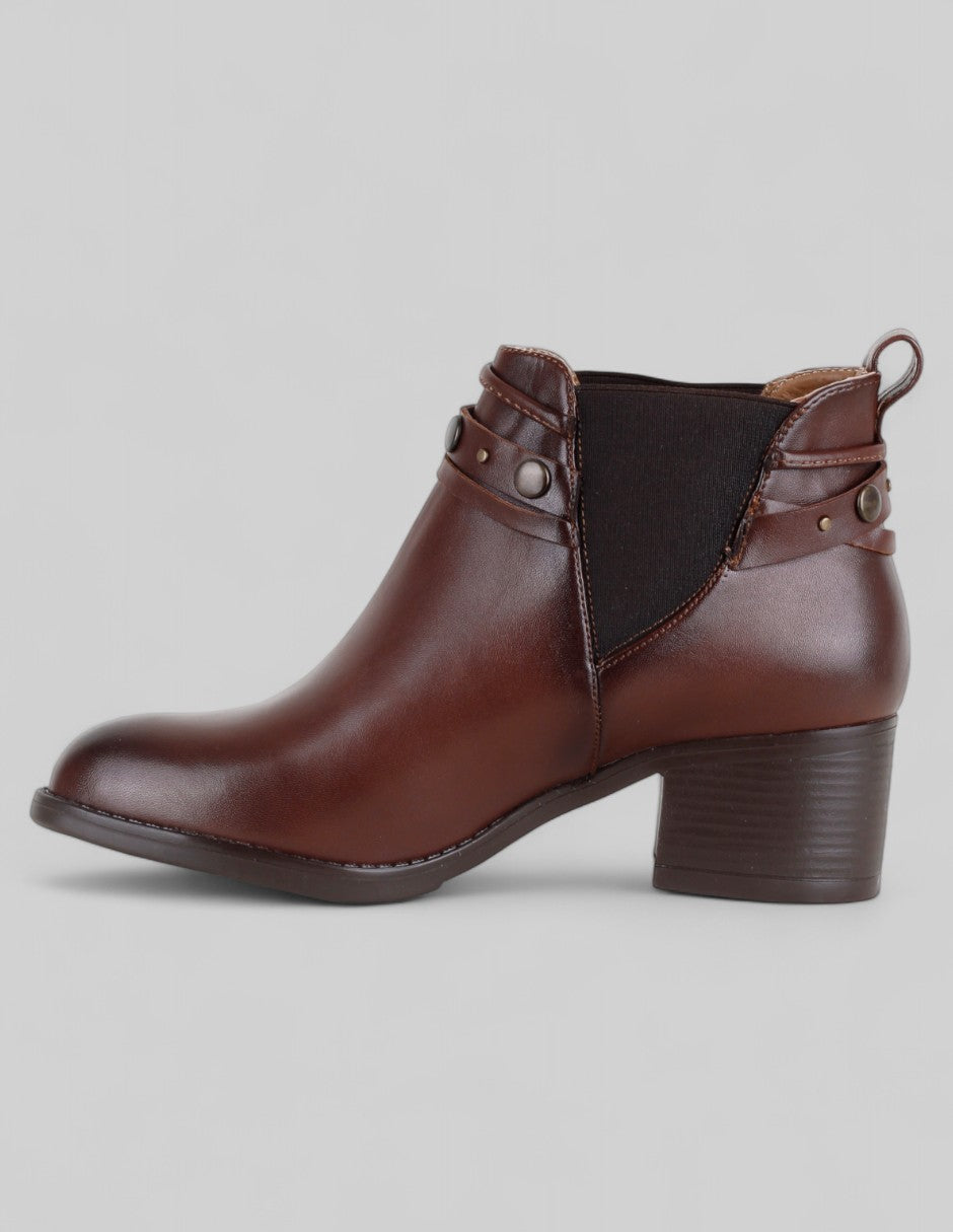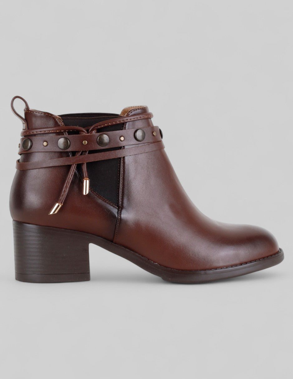El botín con tacón modelo Terre de RBCOLLECTION en piel vegana color café combina diseño funcional y estilo urbano. Los estoperoles aportan contraste visual, mientras el ajuste de un tiempo permite calzarlo con facilidad. Ideal para acompañarte al trabajo o salidas casuales. ¡Adquiérelo ahora y renueva tu look con personalidad!