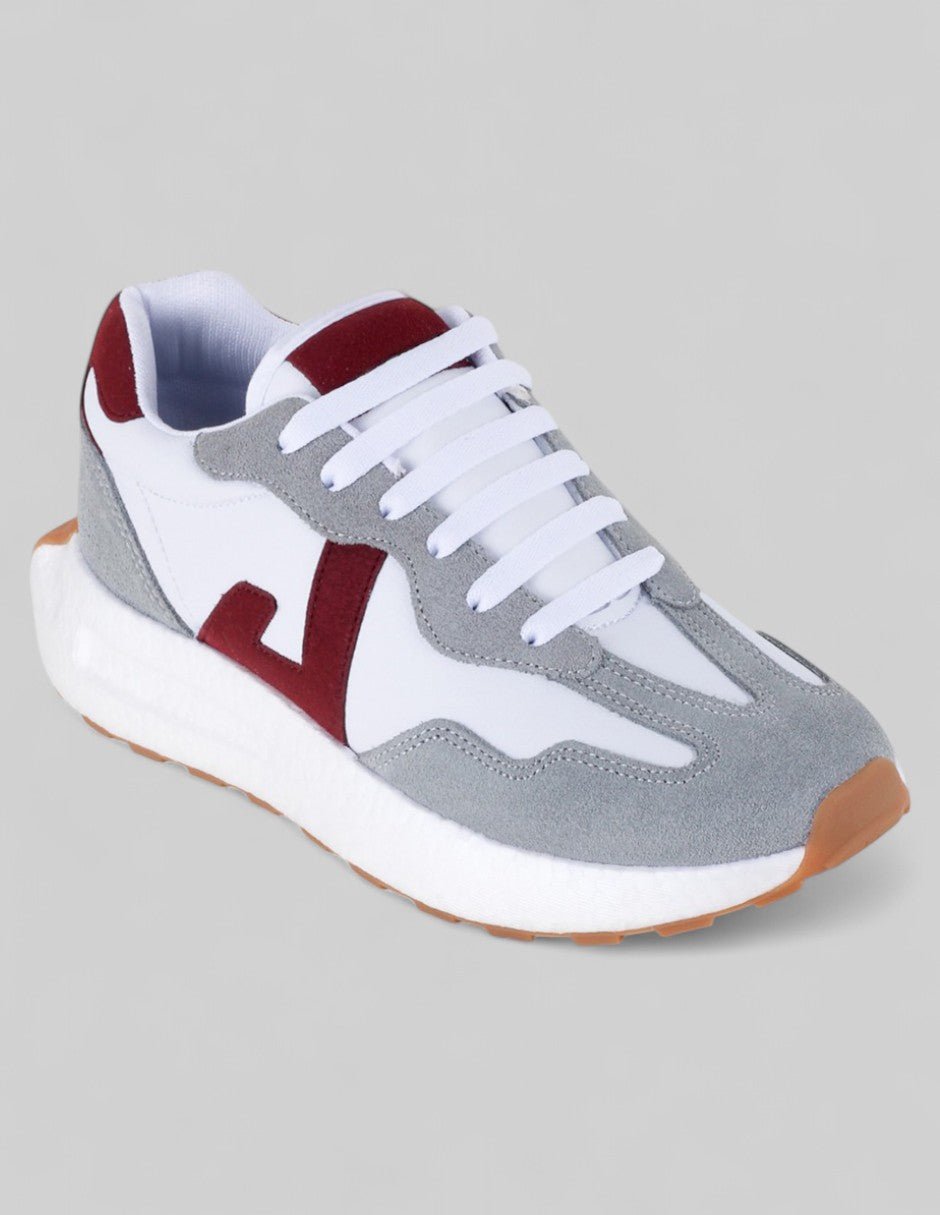 Los tenis con cordones modelo Highline de RBCOLLECTION en piel vegana color blanco mezclan tonos gris y vino que dan un giro fresco al look de diario. Combinan bien con jeans, joggers o vestidos relajados. La suela contrastante suma personalidad. ¡Agrégalos a tu carrito y renueva tus pasos hoy!