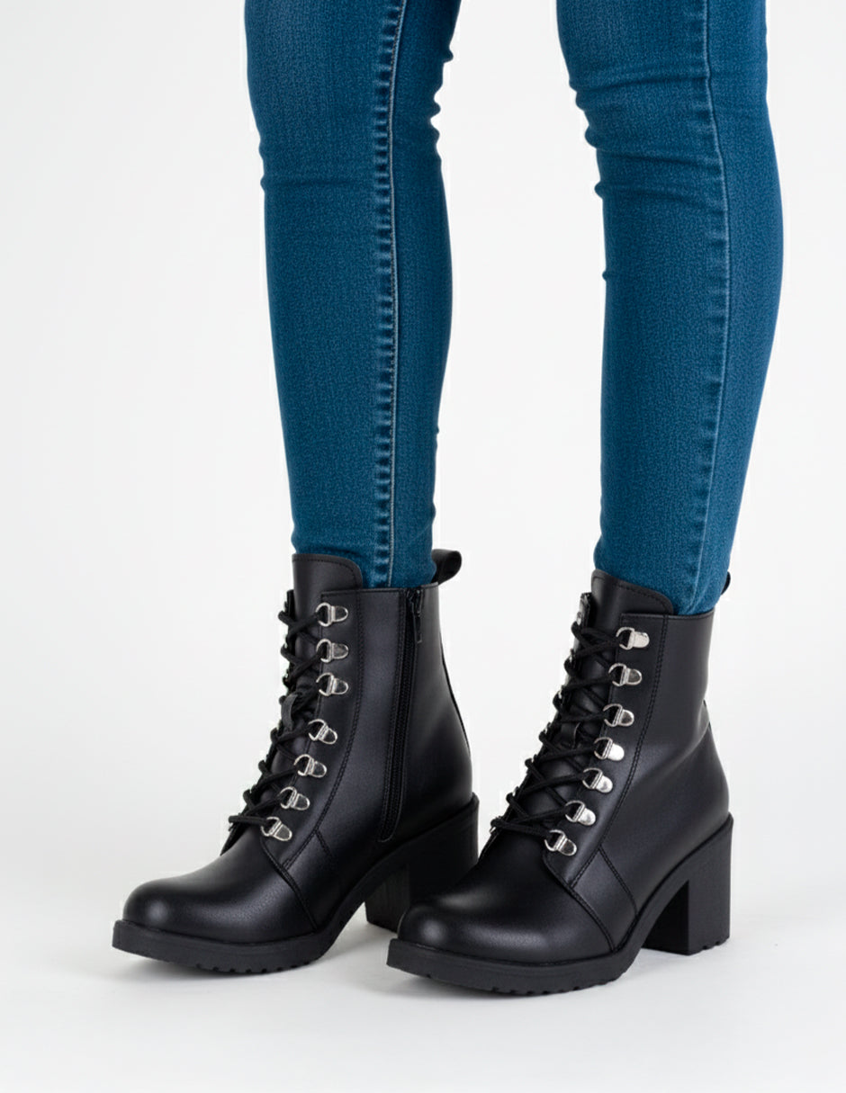 Las botines con tacón modelo Bite de RBCOLLECTION en piel vegana color negro proyectan carácter y estilo definido. El ajuste con agujeta brinda sujeción firme, ideal para caminar con seguridad en trayectos urbanos. Perfectas para combinar con jeans, abrigos o prendas de inspiración industrial. ¡Agrégalas a tu carrito y renueva tu look diario!
