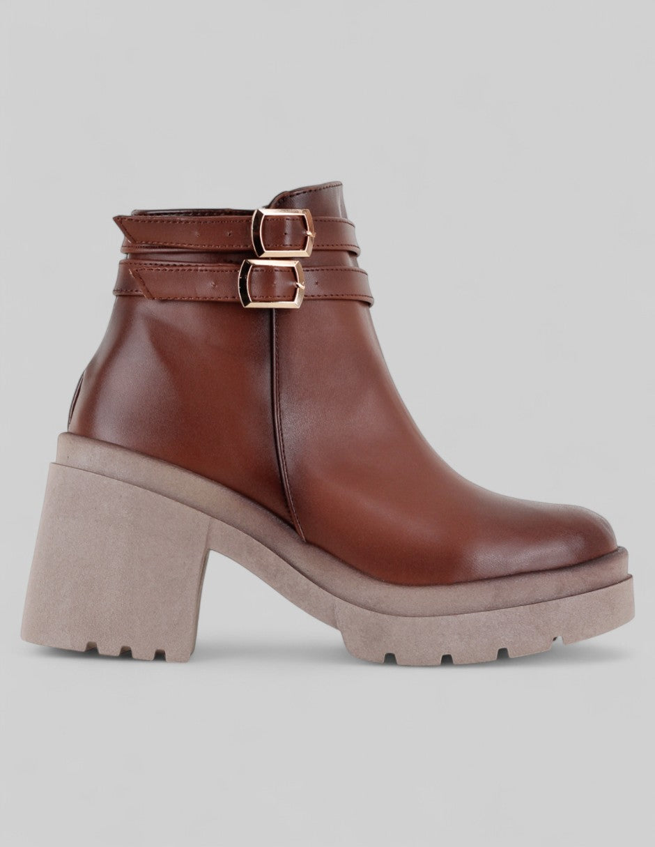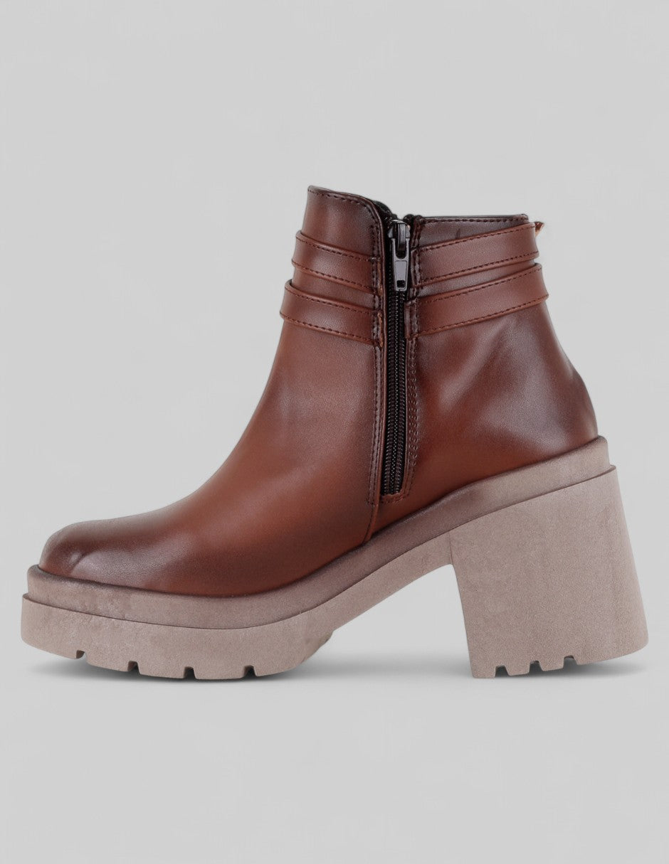 Los botines con tacón modelo Doro de RBCOLLECTION en piel vegana color café integran una hebilla decorativa que aporta un toque distintivo. El ajuste con cierre facilita su uso diario, ideales para caminatas por la ciudad o reuniones casuales. ¡Llévalos contigo y renueva tu estilo urbano desde cualquier dispositivo!