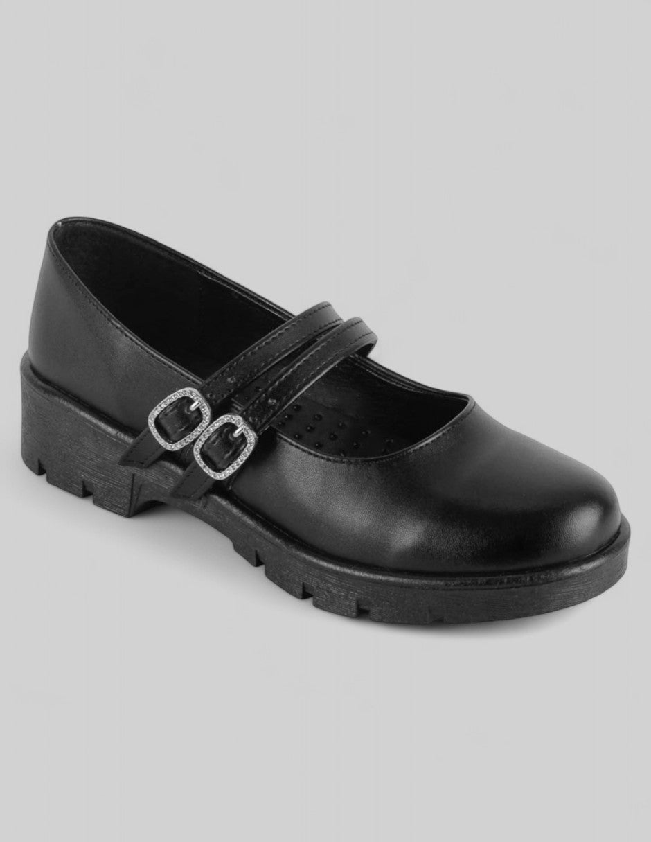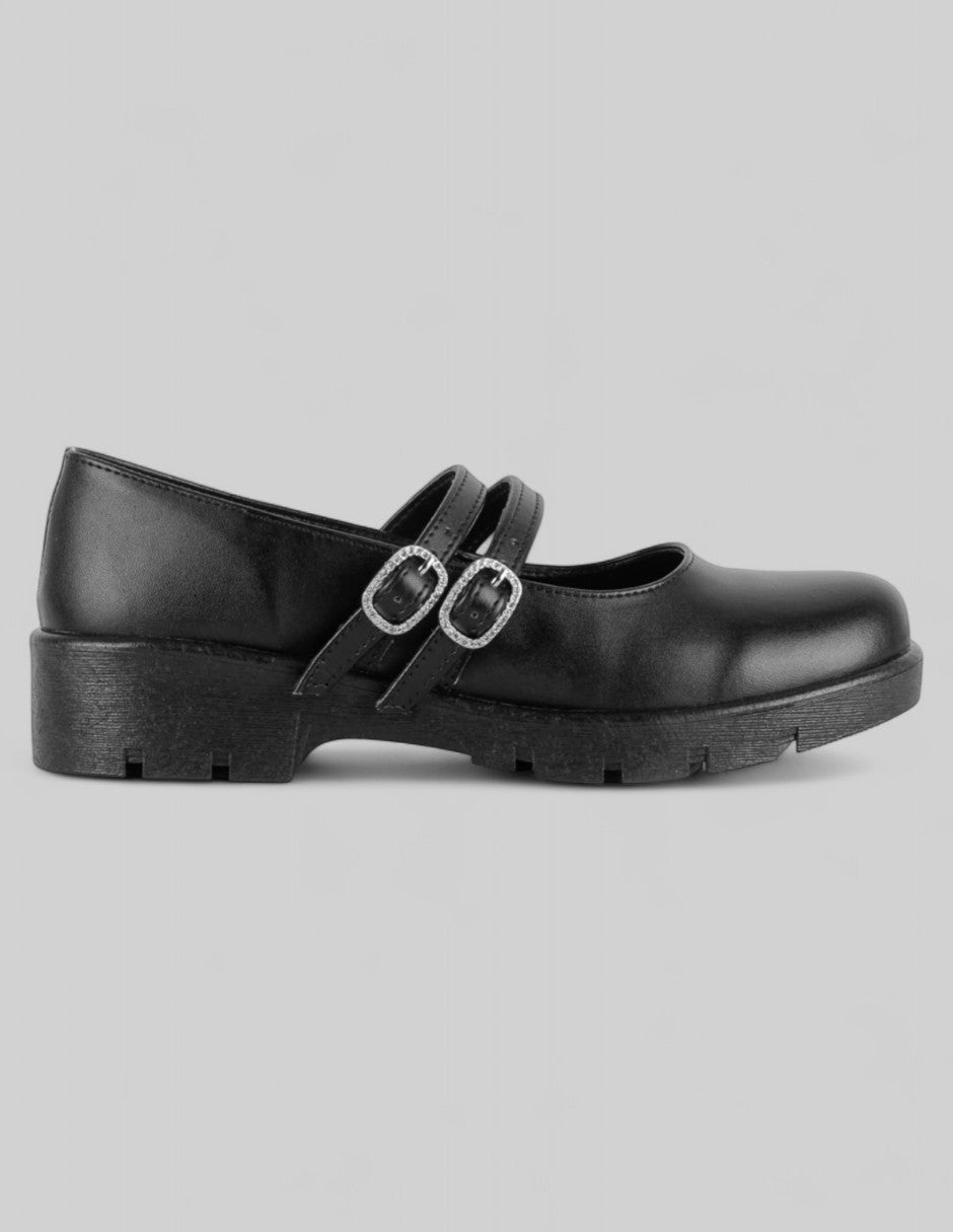 Las Mary Jane modelo Classy de RBCOLLECTION en piel vegana negra combinan estructura firme y detalles brillantes. Los dobles tirantes con hebillas decoradas con pedrería equilibran funcionalidad y estilo. Perfectas para el trabajo, clases o salidas casuales con jeans rectos. ¡Incorpora elegancia práctica a tu día con solo un paso en tienda digital!