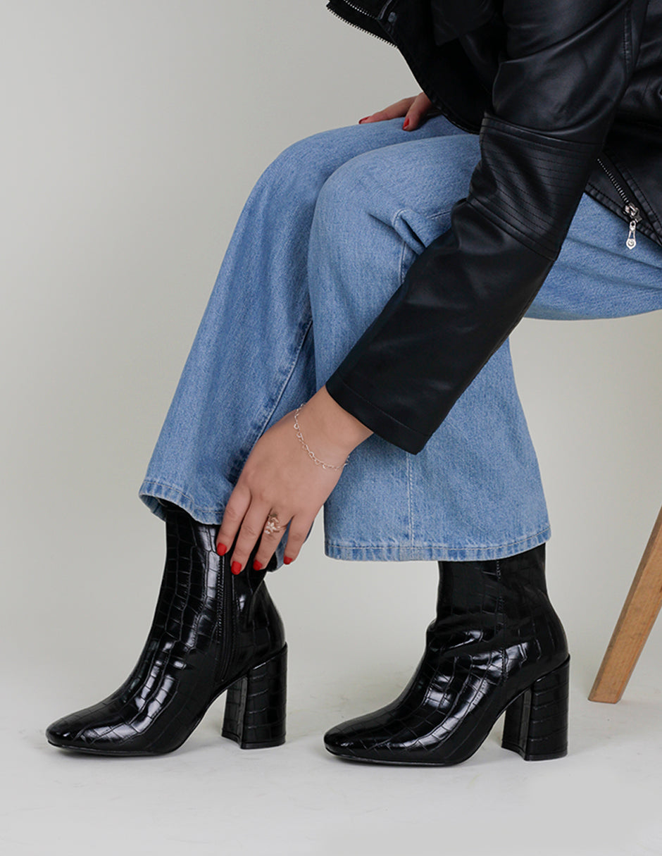 El botín con tacón modelo Aurora de RBCOLLECTION en piel vegana color negro combina textura brillante con una silueta depurada de presencia refinada. El cierre lateral asegura ajuste cómodo para rutinas activas. Ideal con pantalones rectos o vestidos midi estructurados. ¡Adquiérelo online y transforma tu día con un toque elegante y decidido!