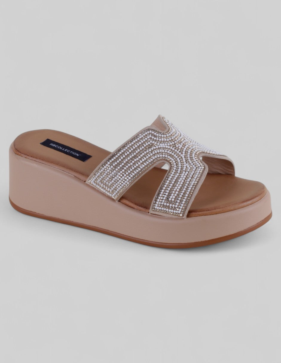 Las sandalias con plataforma modelo Steps de RBCOLLECTION en sintético beige realzan lo cotidiano con un brillo delicado. El detalle de pedrería capta la luz al andar, y su ajuste de un tiempo permite calzarlas con rapidez. Úsalas con vestidos fluidos o jeans claros. ¡Adquiérelas hoy y eleva tu rutina diaria!