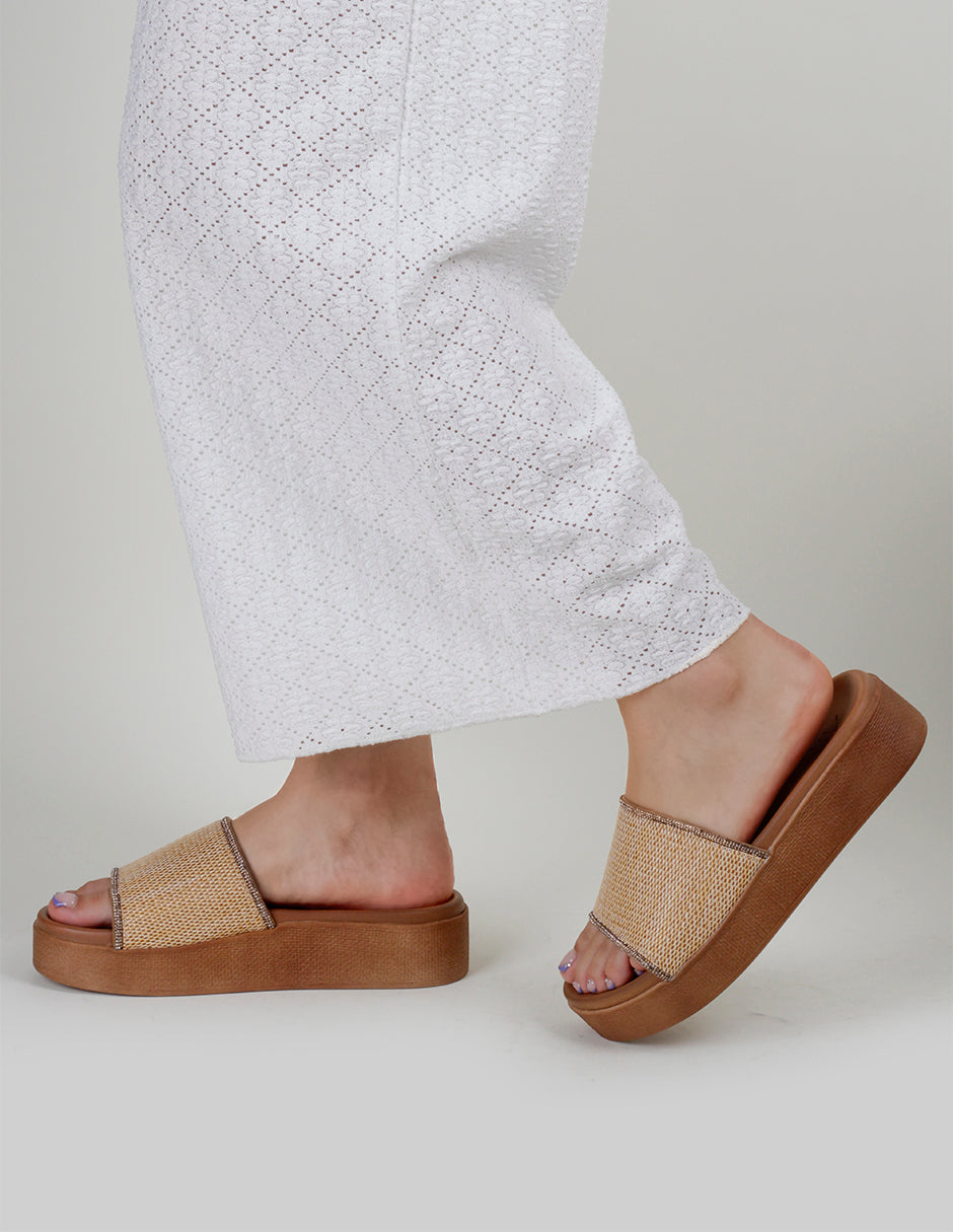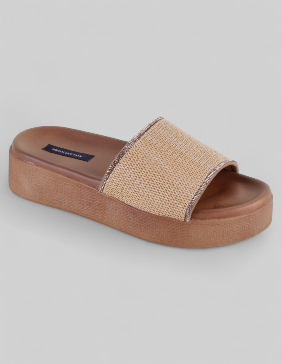 Las sandalias con plataforma modelo Steps de RBCOLLECTION en textil color beige combinan volumen ligero y superficie decorada con pedrería discreta. Su ajuste de un tiempo permite calzarlas al instante, perfectas para desayunos al aire libre, recados cortos o días relajados. ¡Adquiérelas hoy y suma textura y altura a tu día!