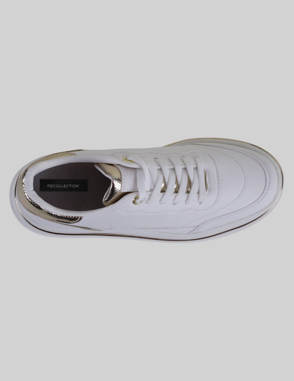 Los tenis deportivos modelo Xoxo de RBCOLLECTION en piel vegana blanco combinan plataforma sutil y líneas doradas que elevan cualquier look casual. El ajuste con agujetas brinda estabilidad para caminar todo el día. Úsalos con jeans amplios o faldas midi. ¡Descúbrelos online y suma estilo cómodo a tu rutina diaria!
