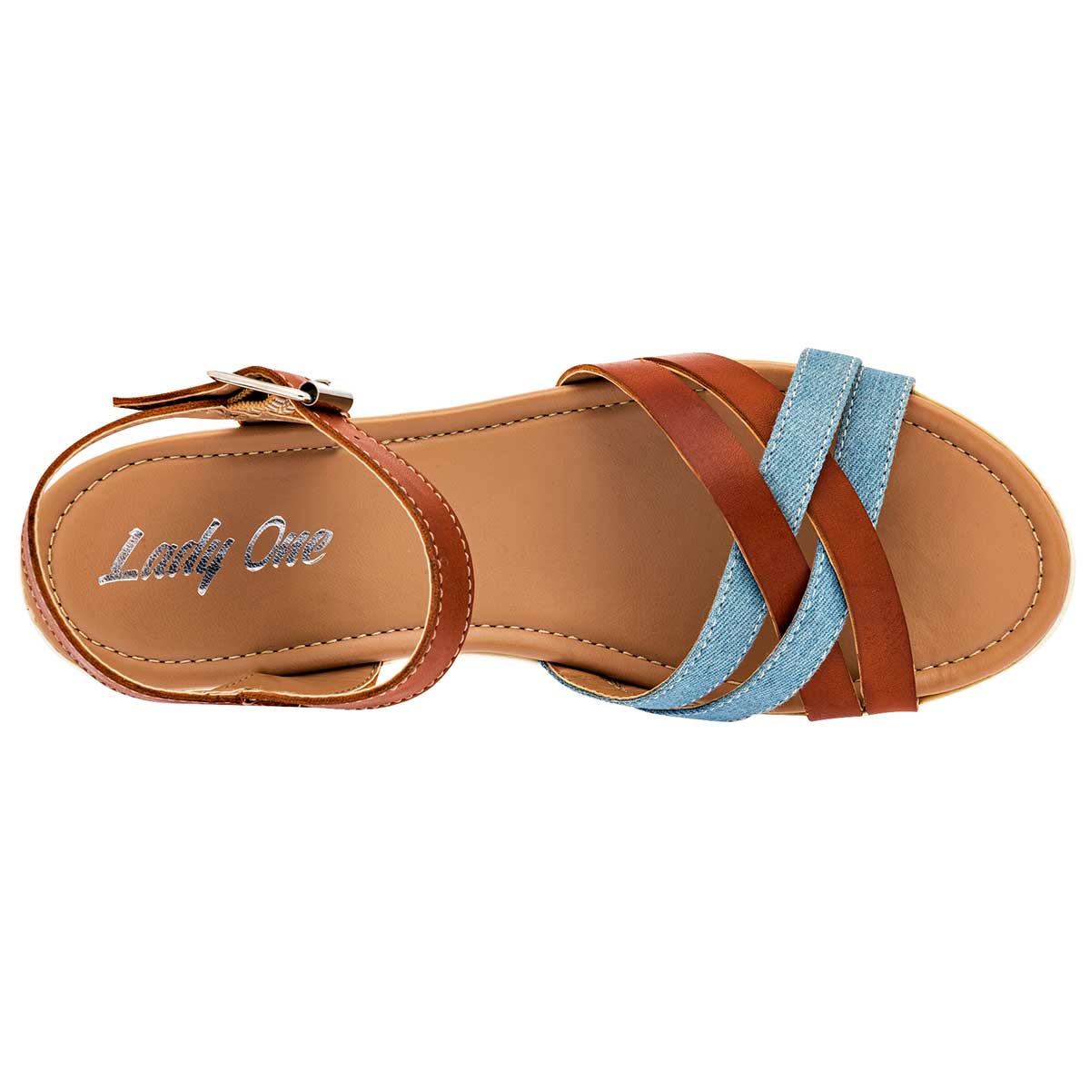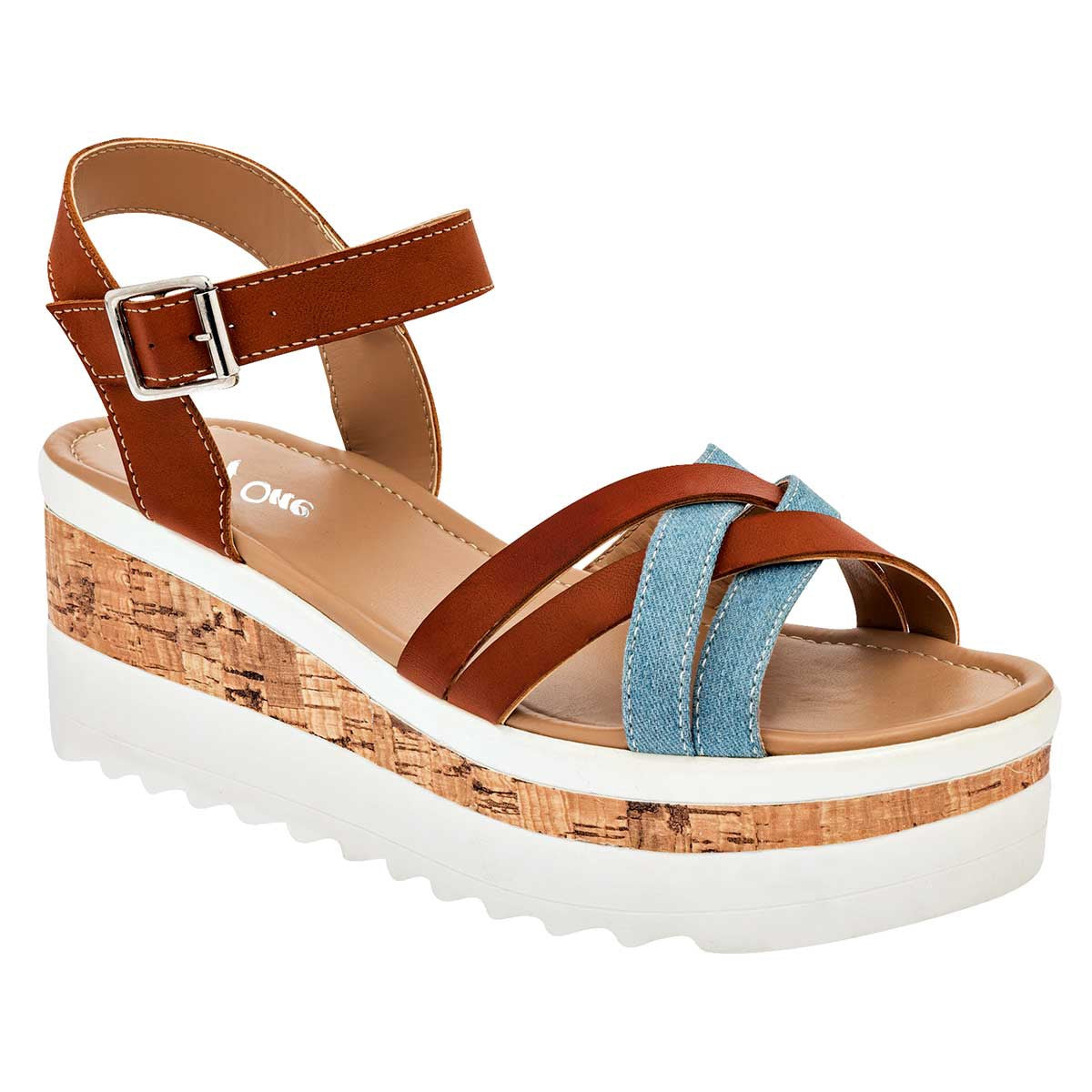 Detalle especial: Cintas cruzadas parte frontal en color mezclilla con camel