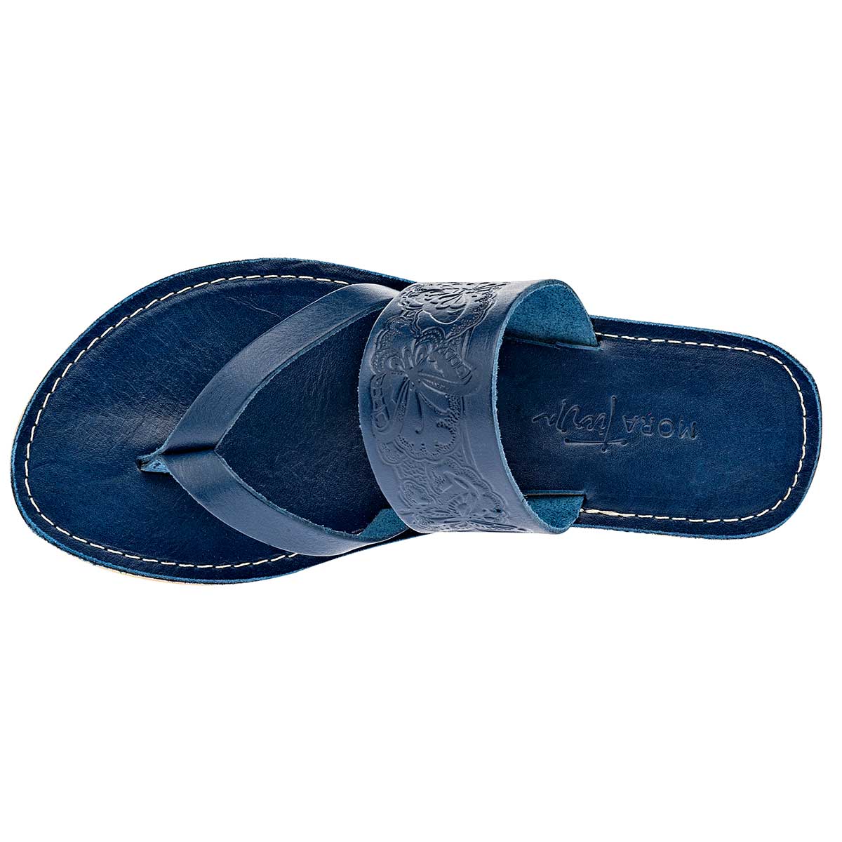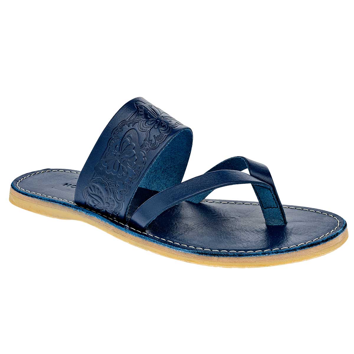 Sandalias color azul exterior piel, ajuste slip - on, construcción nacional