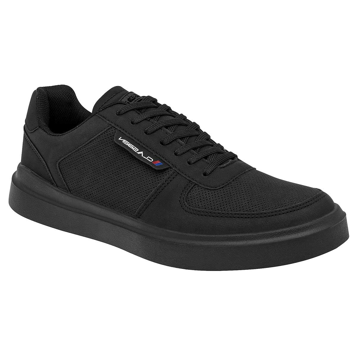Tenis tipo deportivo color negro exterior sintético, ajuste con agujeta, construcción vegano