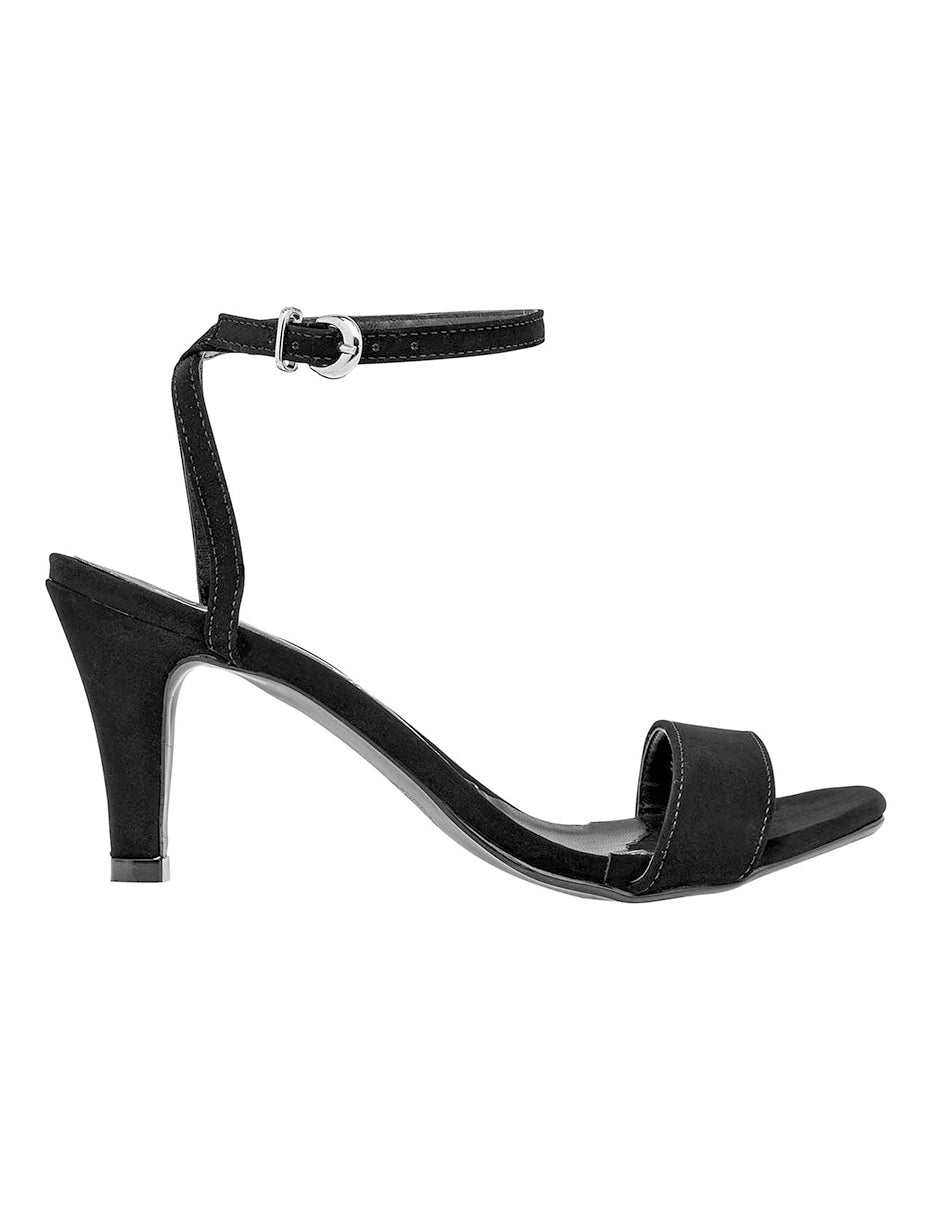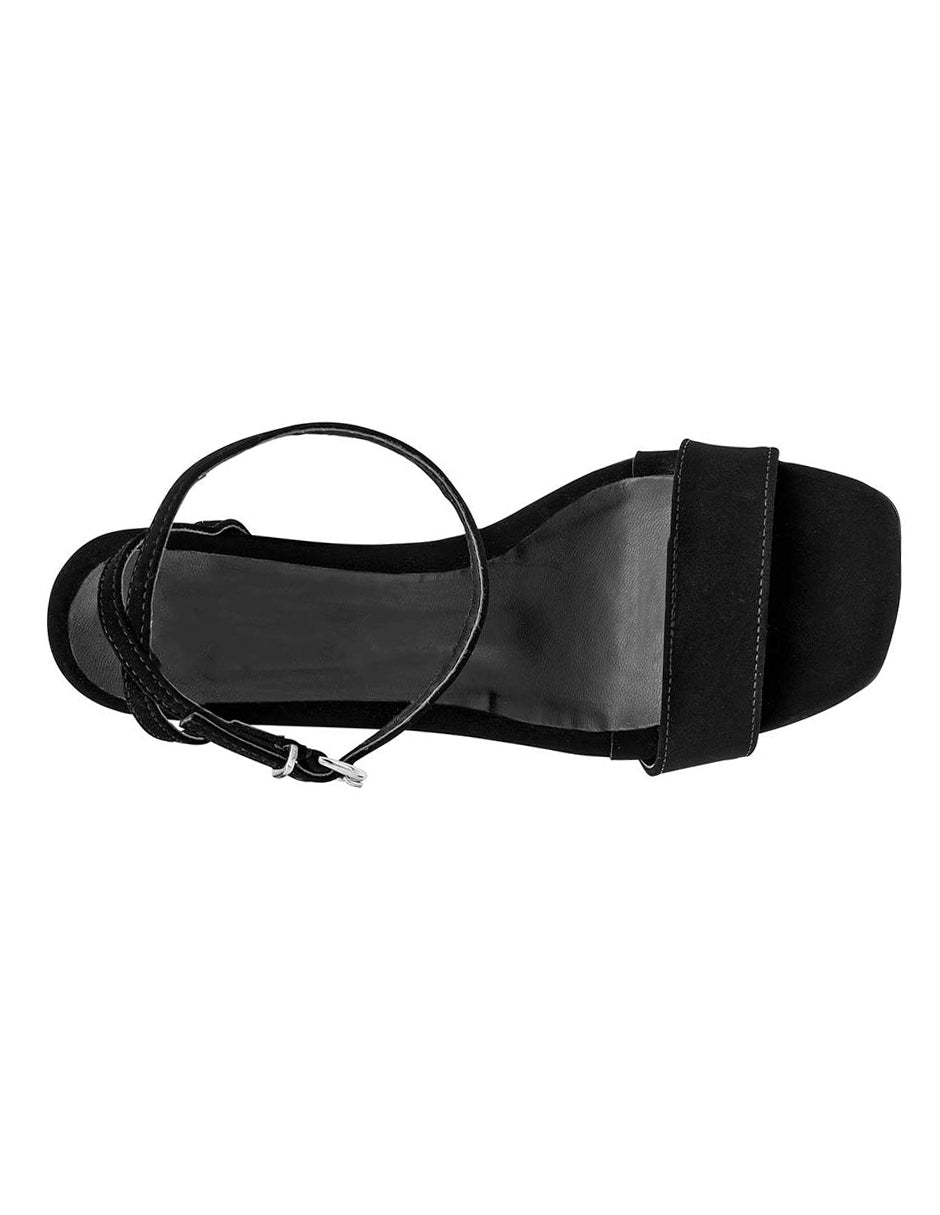 Sandalia con tacón color negro exterior textil, ajuste con hebilla, construcción vegano