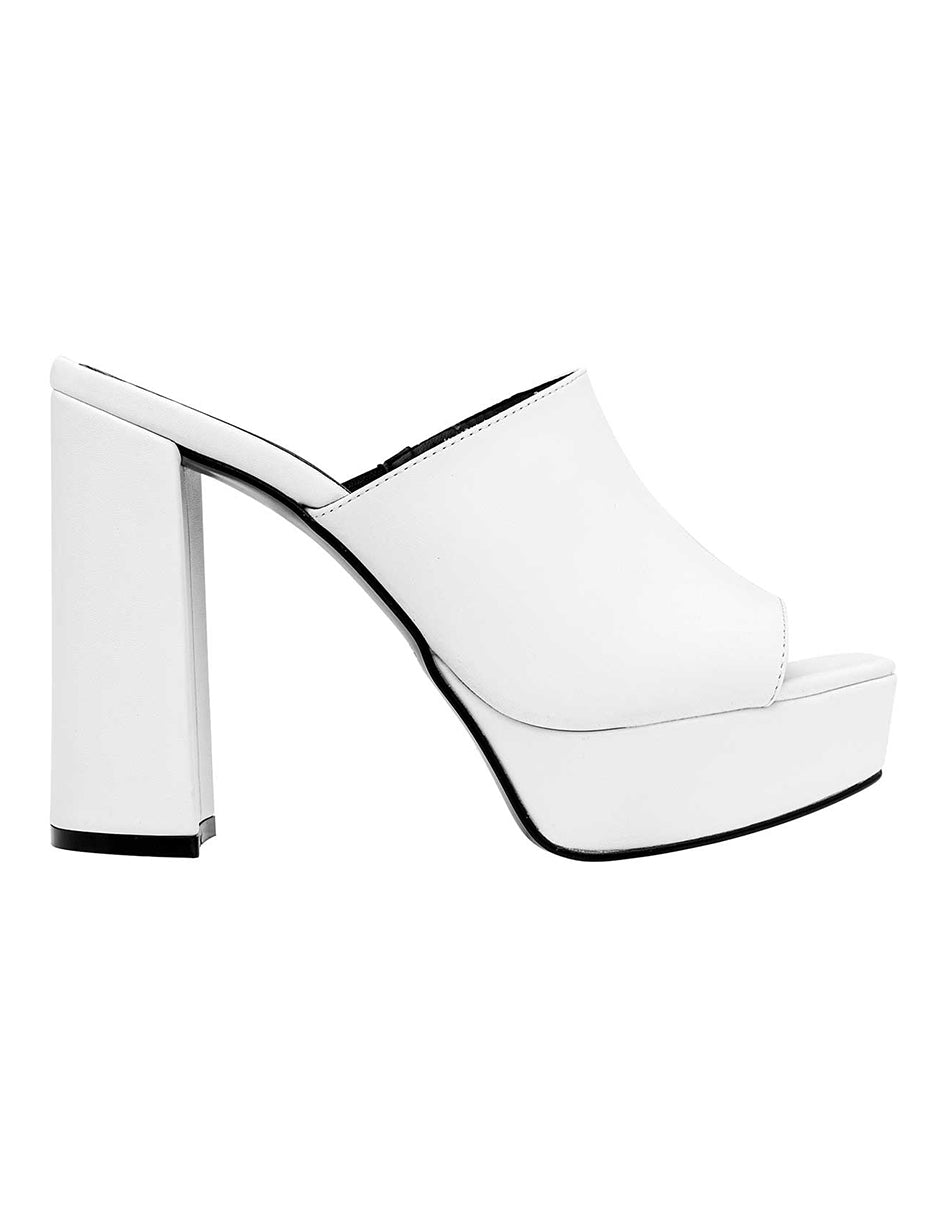 Sandalia con tacón color blanco exterior piel sintético, ajuste con hebilla, construcción vegano