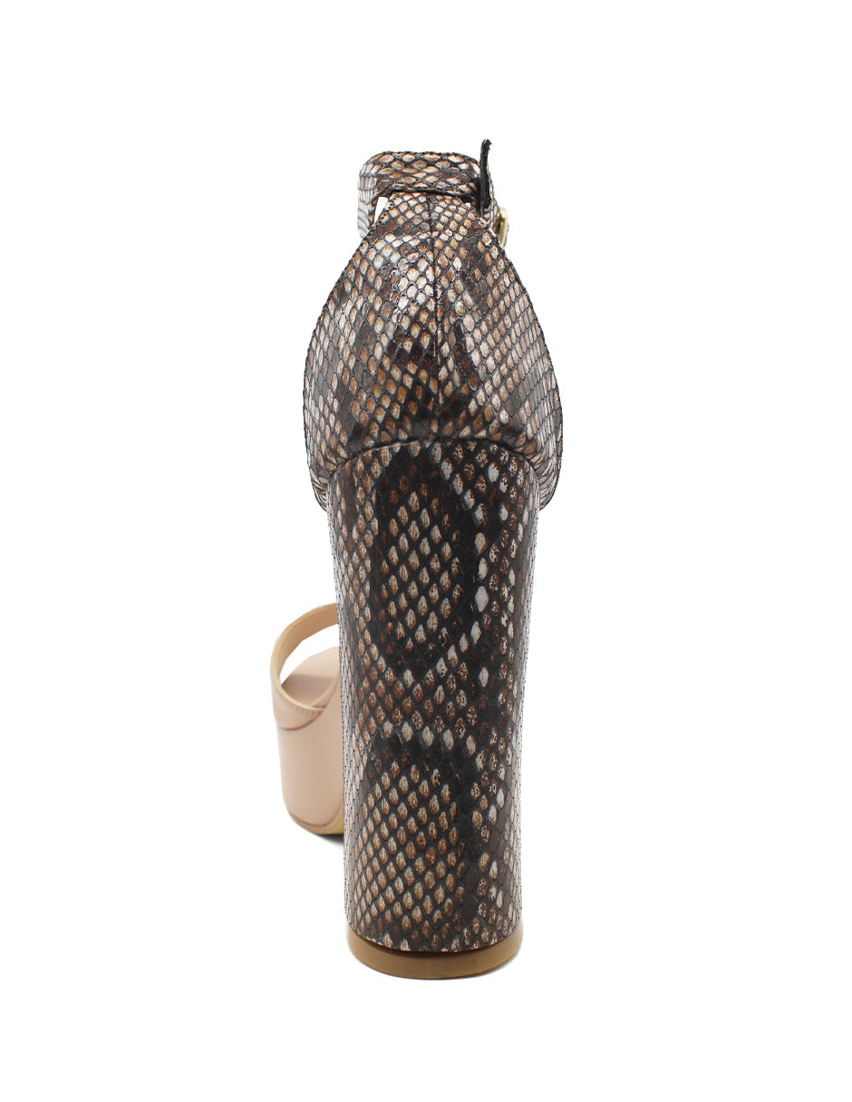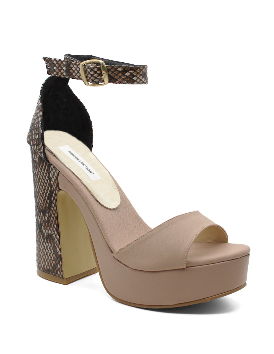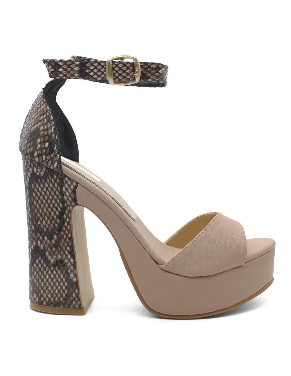 Sandalia con tacón color beige  exterior sintético, ajuste con hebilla, construcción vegano