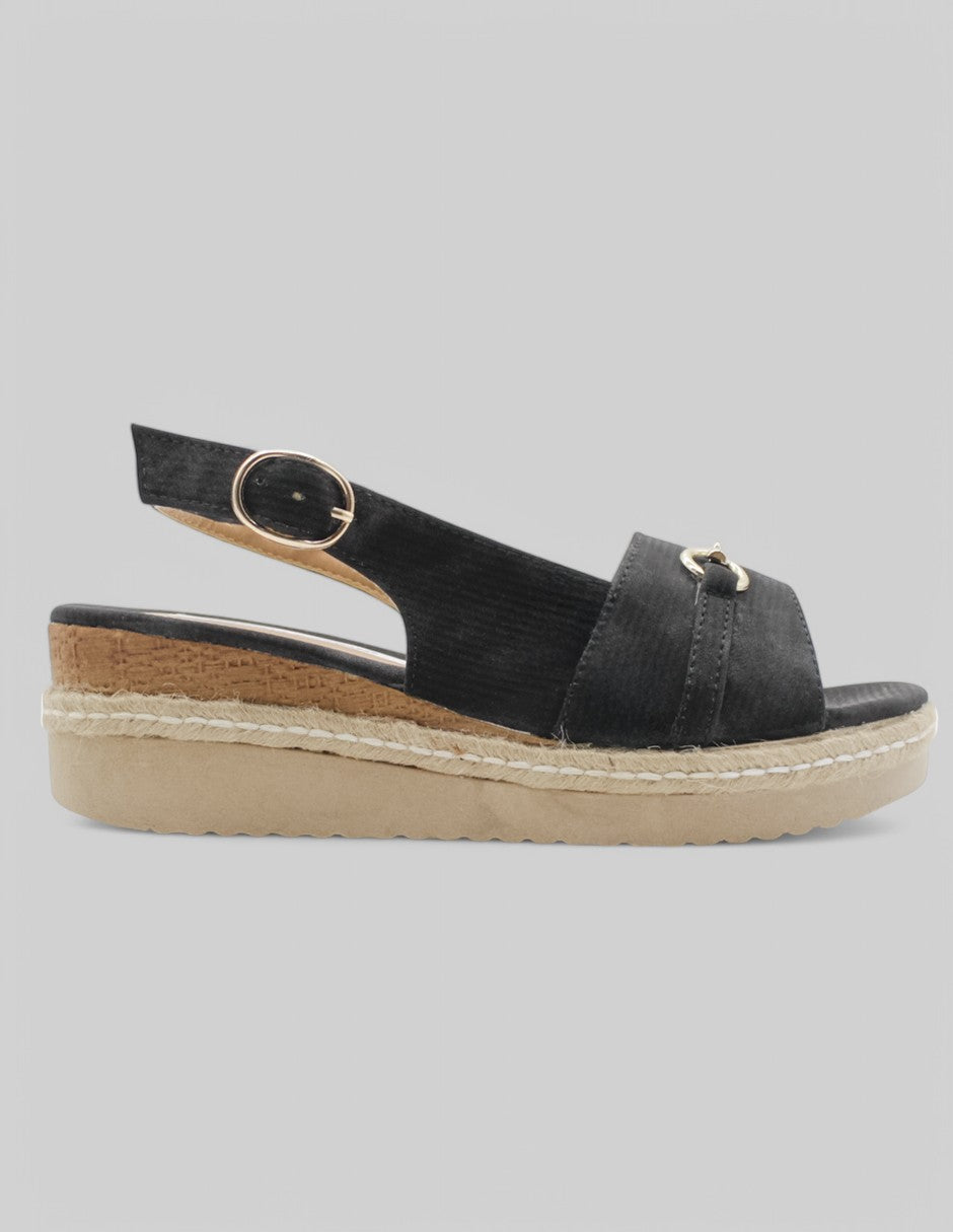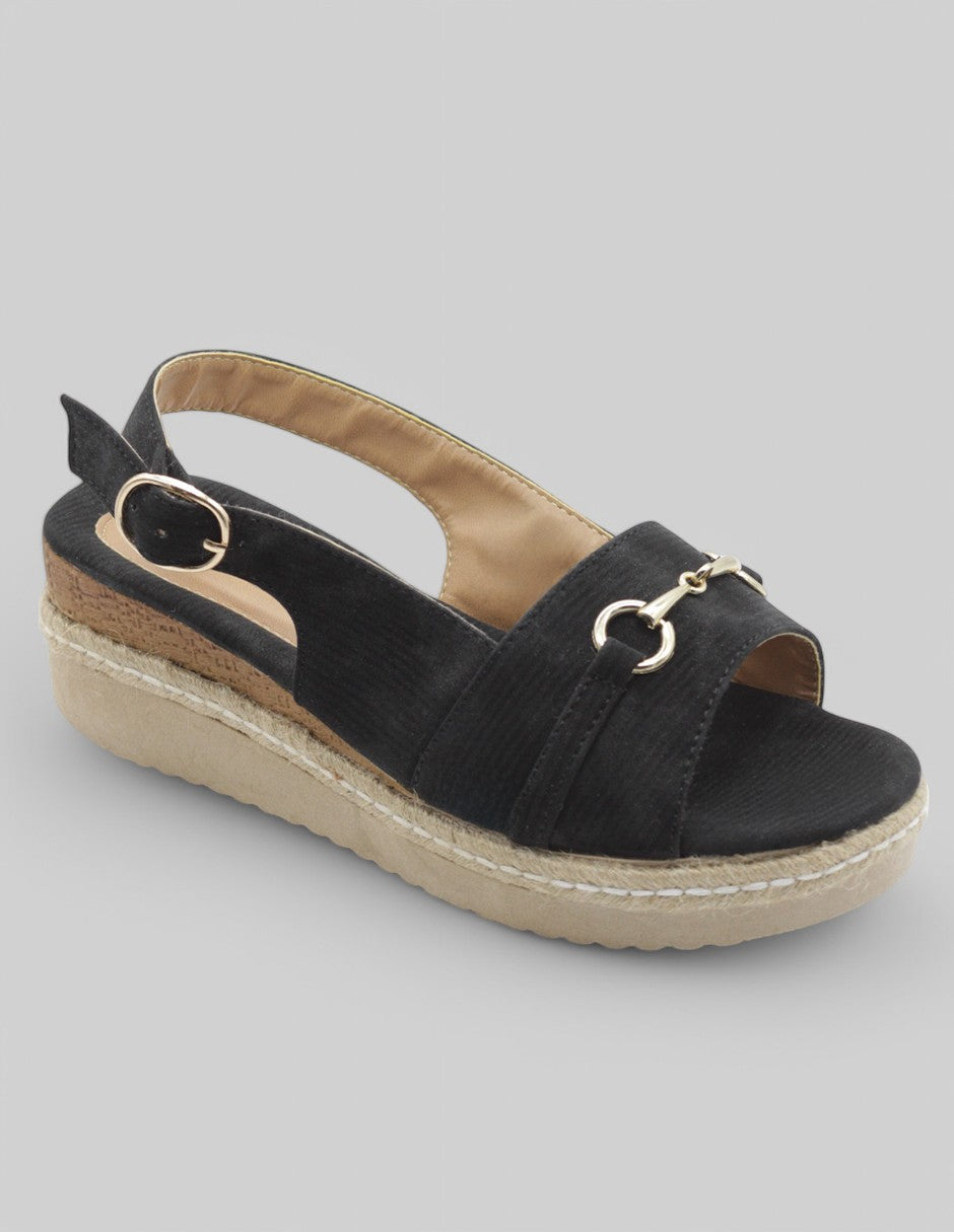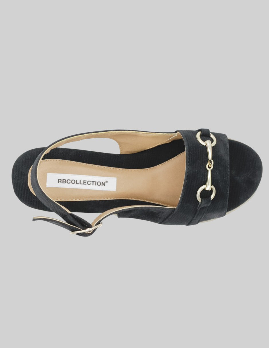La sandalia con plataforma Onne de RBCOLLECTION es ideal para caminar cómoda y con estilo. Su acabado textil negro y detalle metálico le dan un toque moderno. Perfecta para pies delgados, anchos o largos: se recomienda pedir una talla abajo. ¡Súmate a la comodidad sin perder el estilo, ordénalas ya!