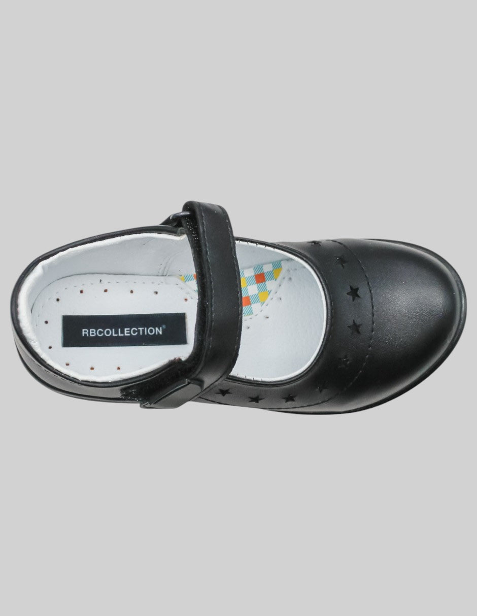 Los zapatos escolares para niña de RBCOLLECTION, modelo Kids, en piel color negro, combinan comodidad y estilo para el día a día. Su ajuste de velcro y diseño clásico los hacen prácticos y seguros. Ideales para acompañarla en cada paso. ¡Haz que disfrute sus jornadas con el mejor calzado!