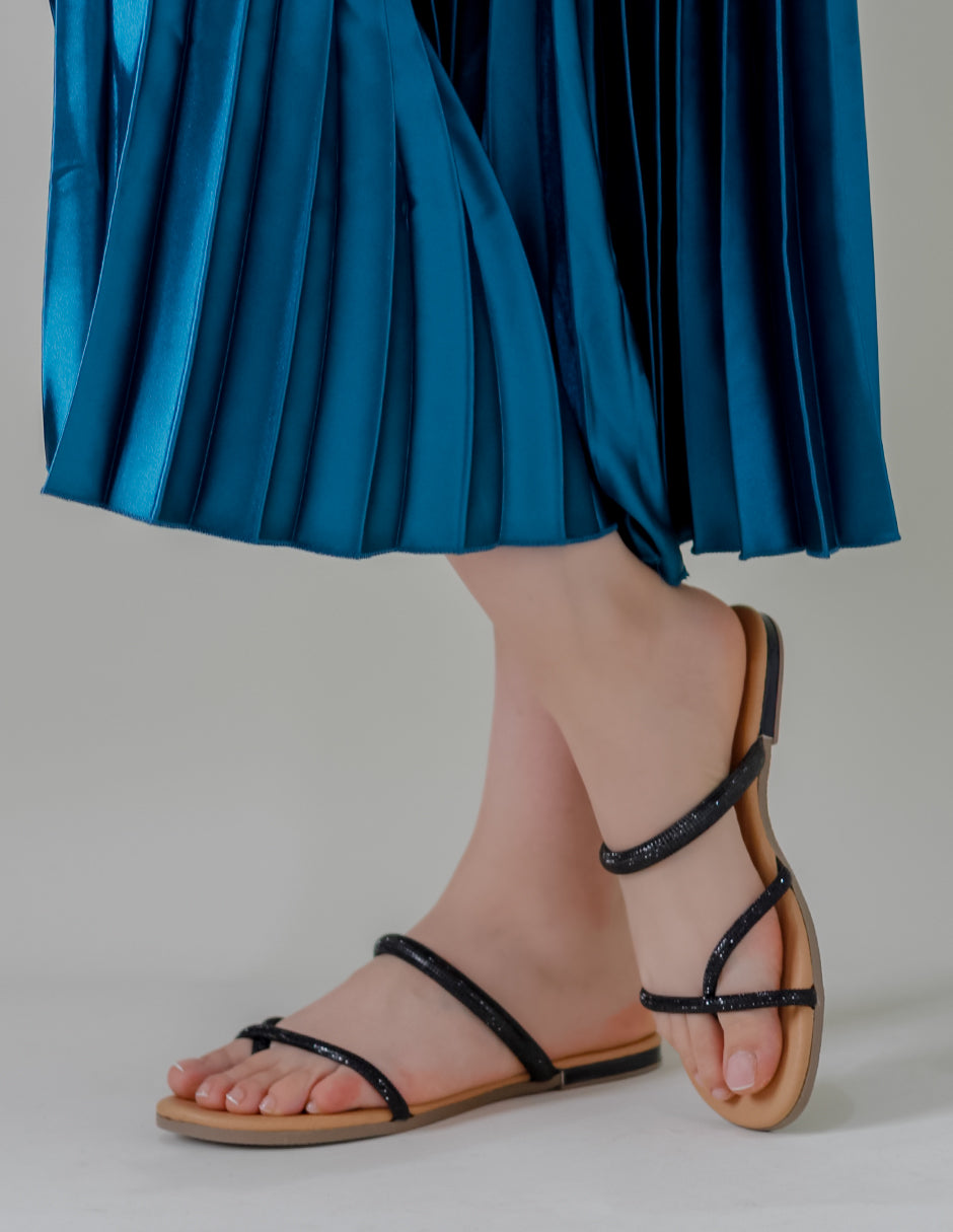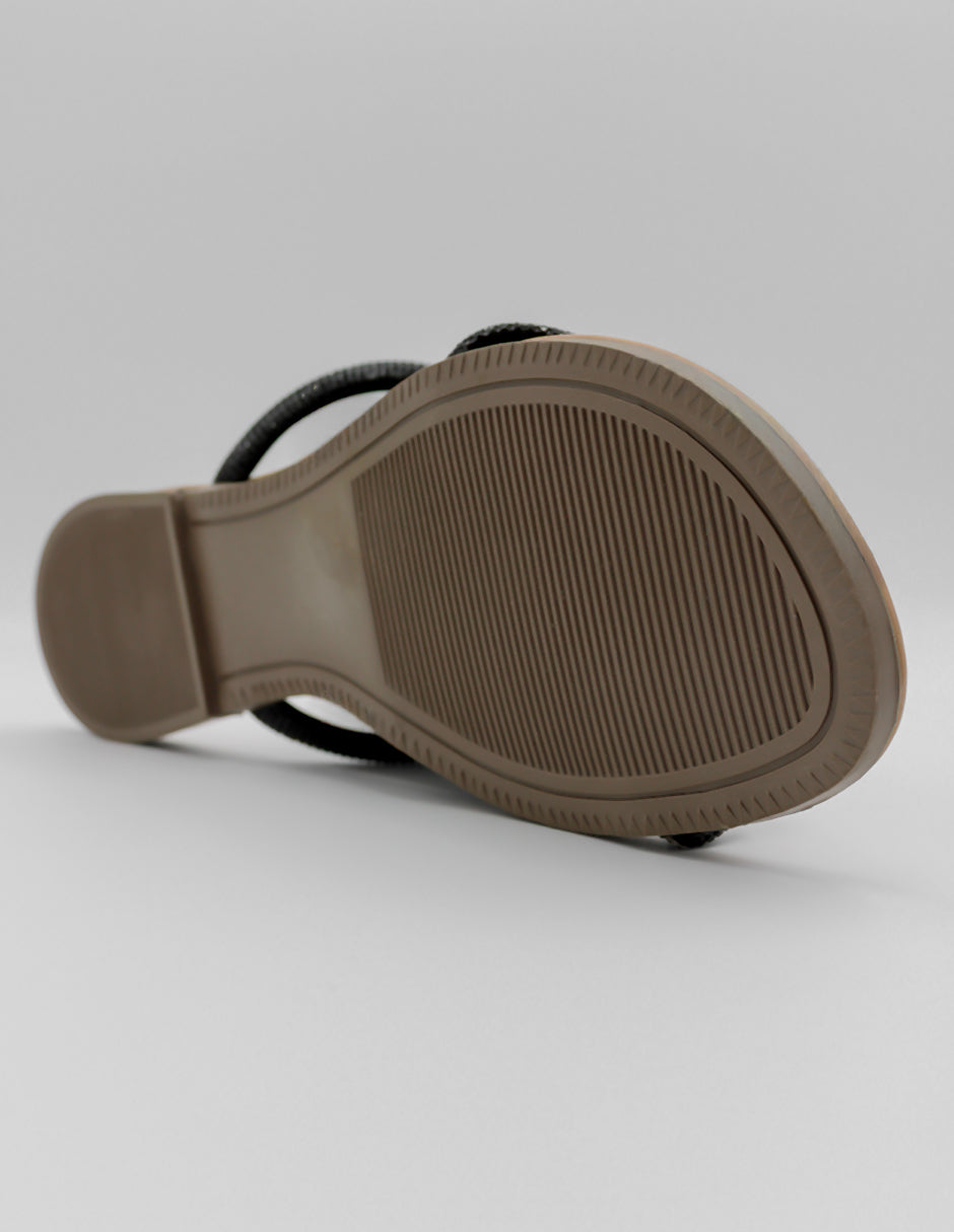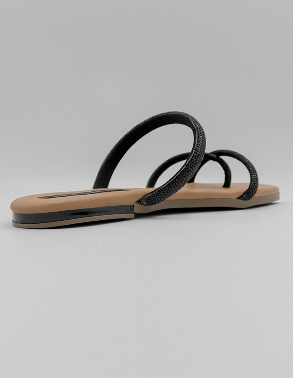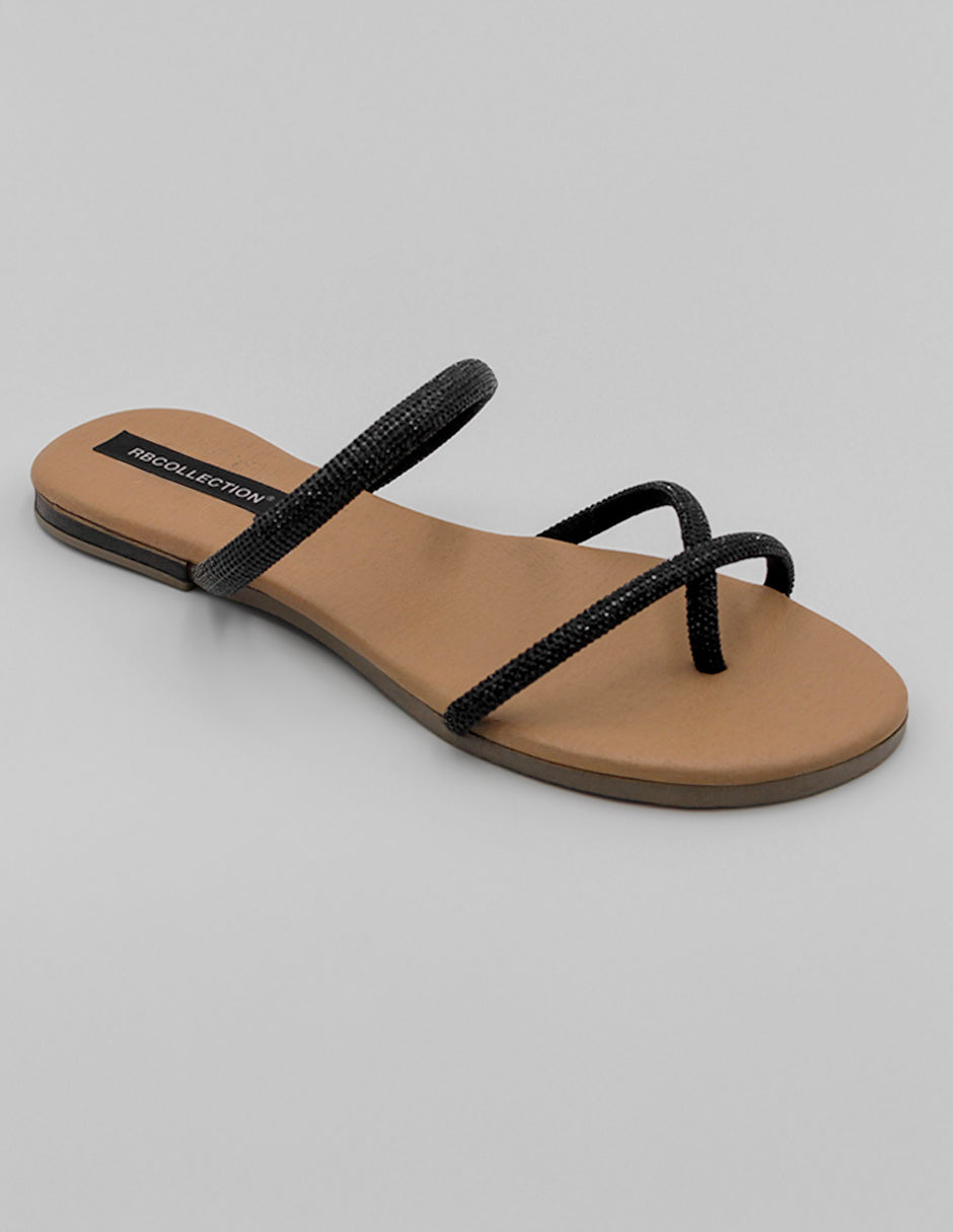 Las sandalias de piso modelo Soft de RBCOLLECTION en textil color negro combinan diseño minimalista y versatilidad. Su ajuste seguro y cómodo las hace perfectas para cualquier ocasión. El detalle de pedrería añade un toque sofisticado, ideal para complementar cualquier outfit.