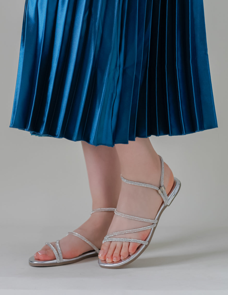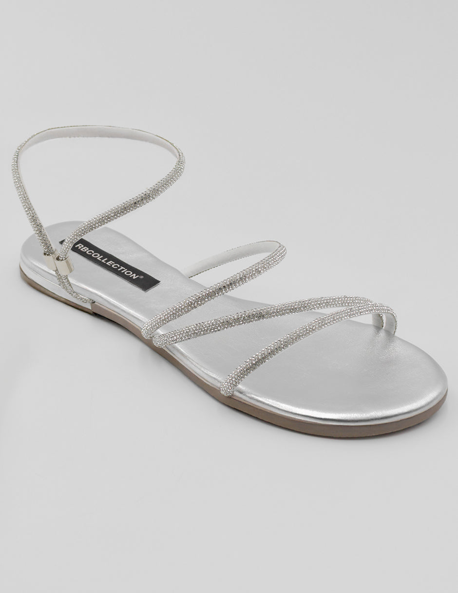 Las sandalias de piso modelo Soft de RBCOLLECTION en textil color plata combinan elegancia y comodidad. Su diseño minimalista se complementa con una pulsera ajustable en el tobillo para un ajuste seguro. Detalles de pedrería añaden un toque sofisticado, haciéndolas perfectas para cualquier ocasión.