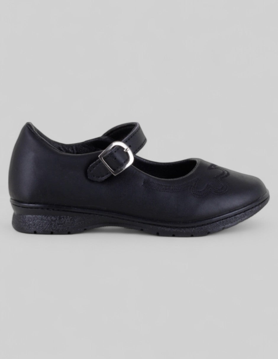 Los zapatos escolares en piel vegana color negro para niña de RBCOLLECTION ofrecen un diseño clásico con toque tierno. Su correa con hebilla brinda ajuste seguro para el uso diario, mientras la punta redonda garantiza comodidad en cada paso. ¡Ideal para acompañarla en su día a día escolar!