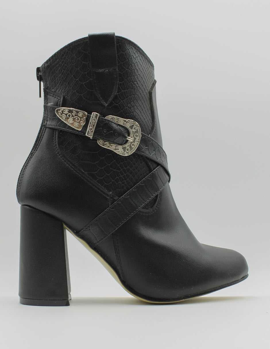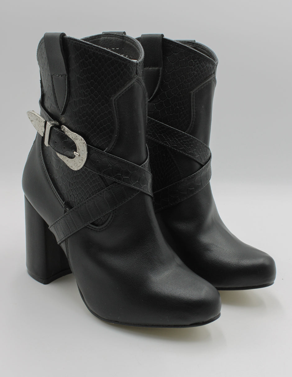 Botines con tacón confeccionados en piel vegana color negro para mujer de Dorothy Gaynor, diseñados para destacar en cualquier ocasión. Este modelo combina un estilo western moderno con un toque elegante gracias a su hebilla decorativa metálica y costuras detalladas.