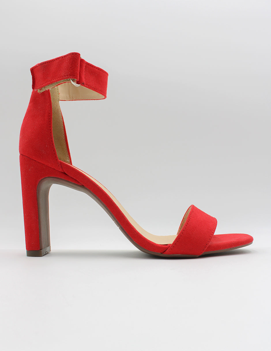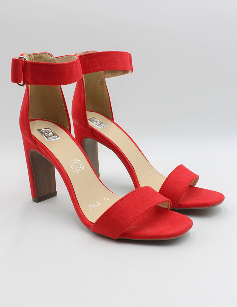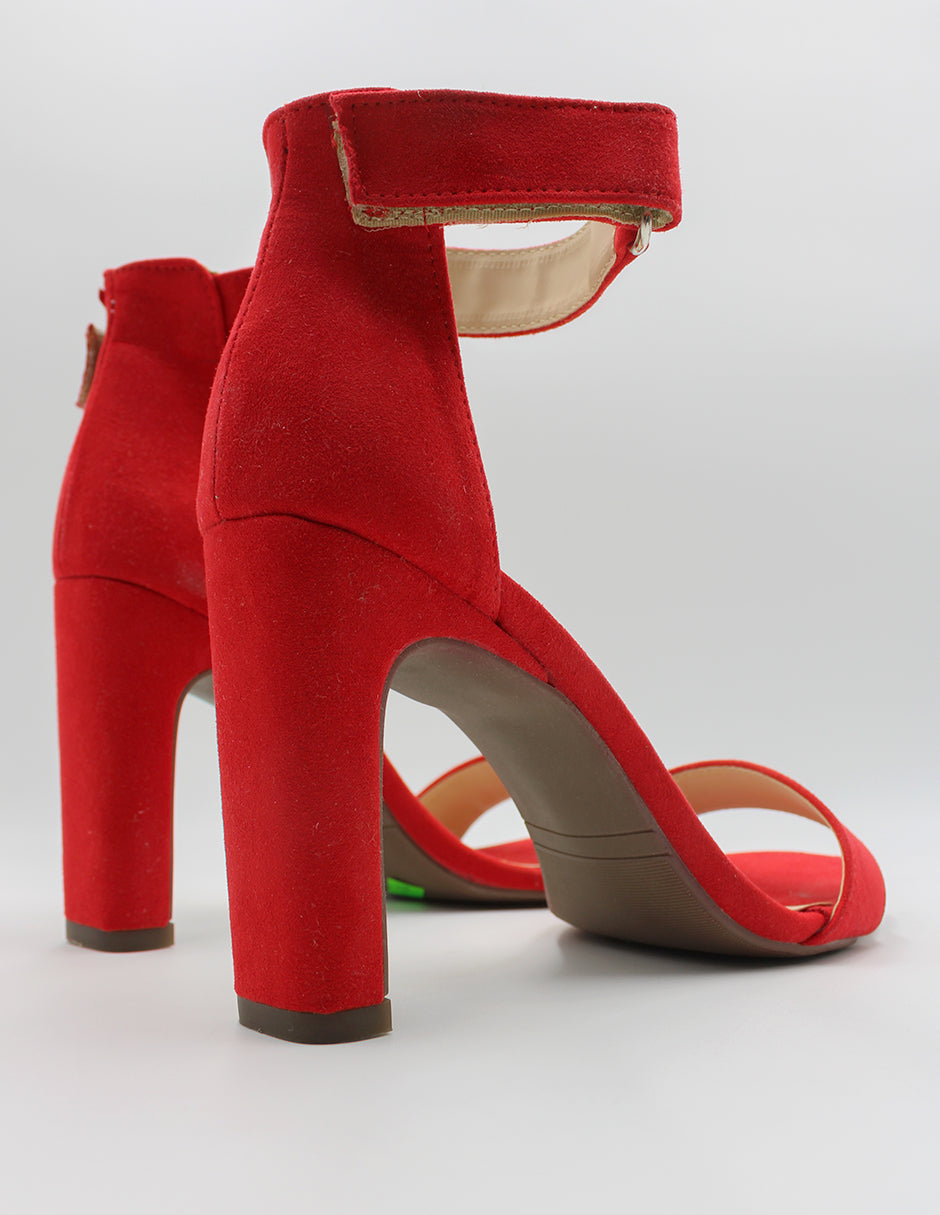 Sandalia con tacón para mujer de León en textil color rojo, diseñada para realzar tu estilo con un toque vibrante y elegante. Este modelo combina un diseño minimalista con una pulsera ajustable al tobillo para un ajuste seguro y cómodo.