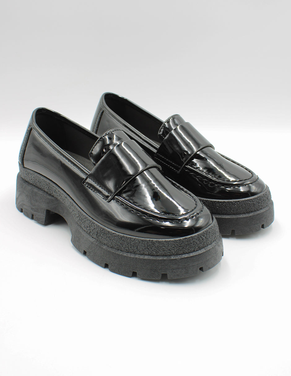 Mocasines de Gotta para mujer, confeccionados en charol negro, que combinan estilo y modernidad con un toque atrevido. Este modelo destaca por su diseño robusto con plataforma elevada y suela dentada, que ofrece un look audaz y vanguardista.