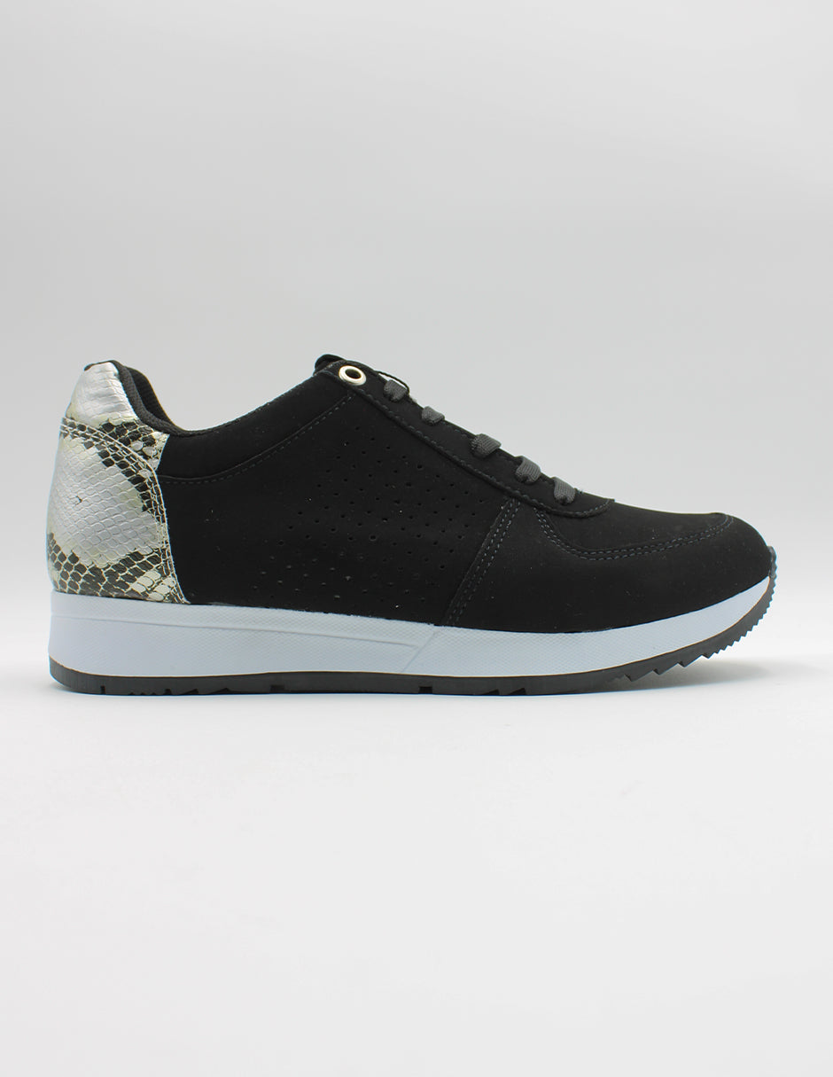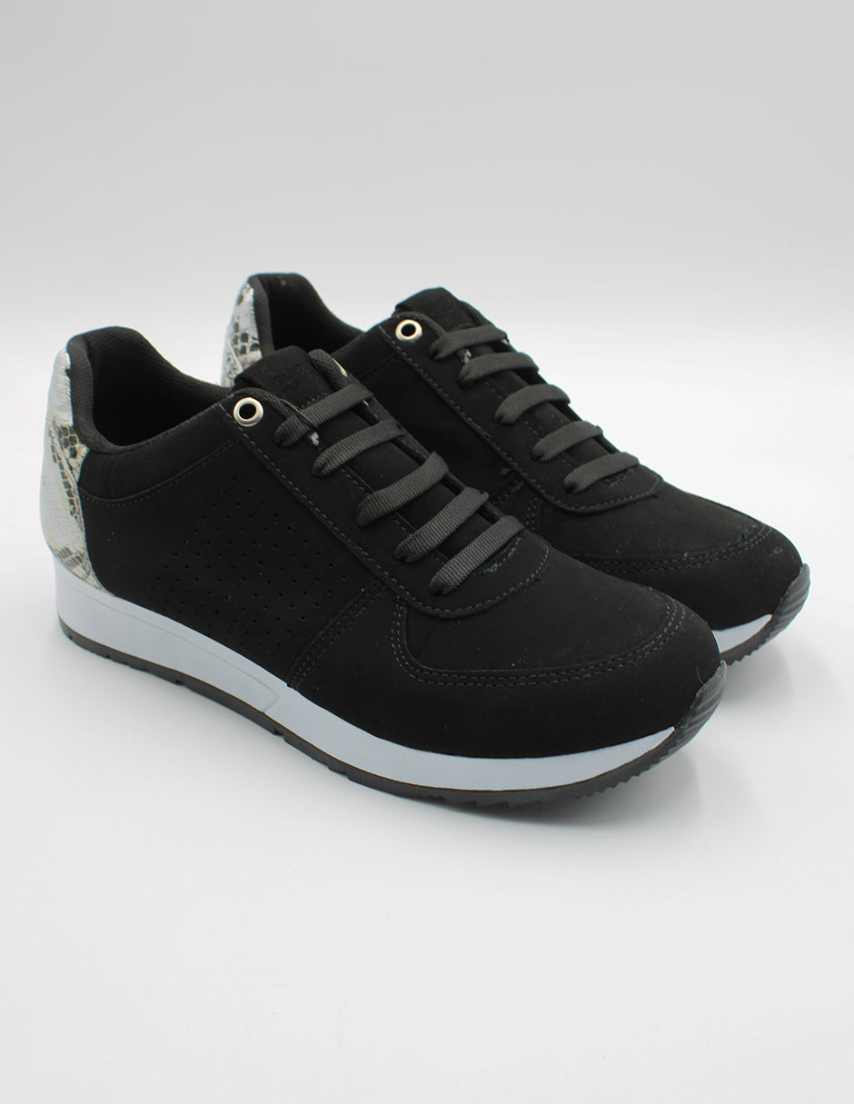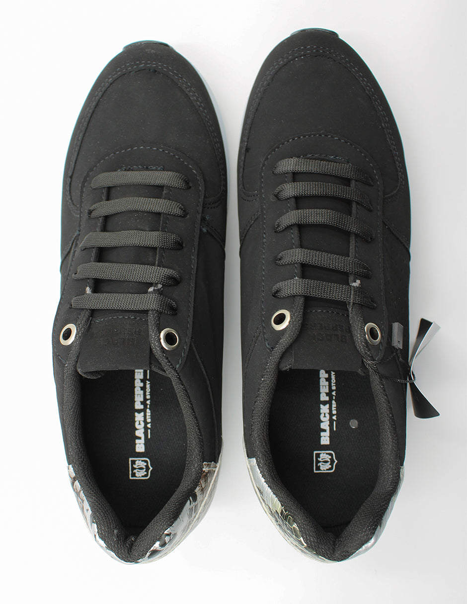 Tenis con cordones para mujer de Peppers, elaborados en gamuza color negro, diseñados para brindar un estilo sofisticado y versátil. Este modelo combina materiales de alta calidad con un diseño contemporáneo que incluye detalles metálicos sutiles en el talón para un toque moderno.