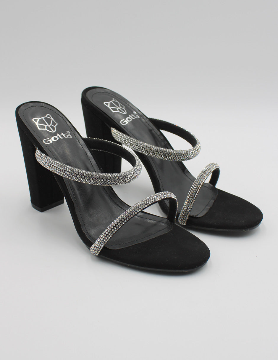 Sandalias Gotta: sofisticación y estilo en cada paso. Este modelo para mujer, confeccionado en textil negro, combina un diseño elegante con detalles brillantes en las tiras que enmarcan el pie de manera delicada. Su tacón alto y cuadrado ofrece altura y estabilidad, asegurando confort durante todo el día o noche. Perfectas para ocasiones especiales, cenas o eventos formales, estas sandalias destacan por su versatilidad y atractivo diseño minimalista. Su acabado en materiales de alta calidad garantiza durabilidad y un toque de glamour que eleva cualquier outfit. Ideales para mujeres que buscan destacar con un calzado sofisticado y moderno.