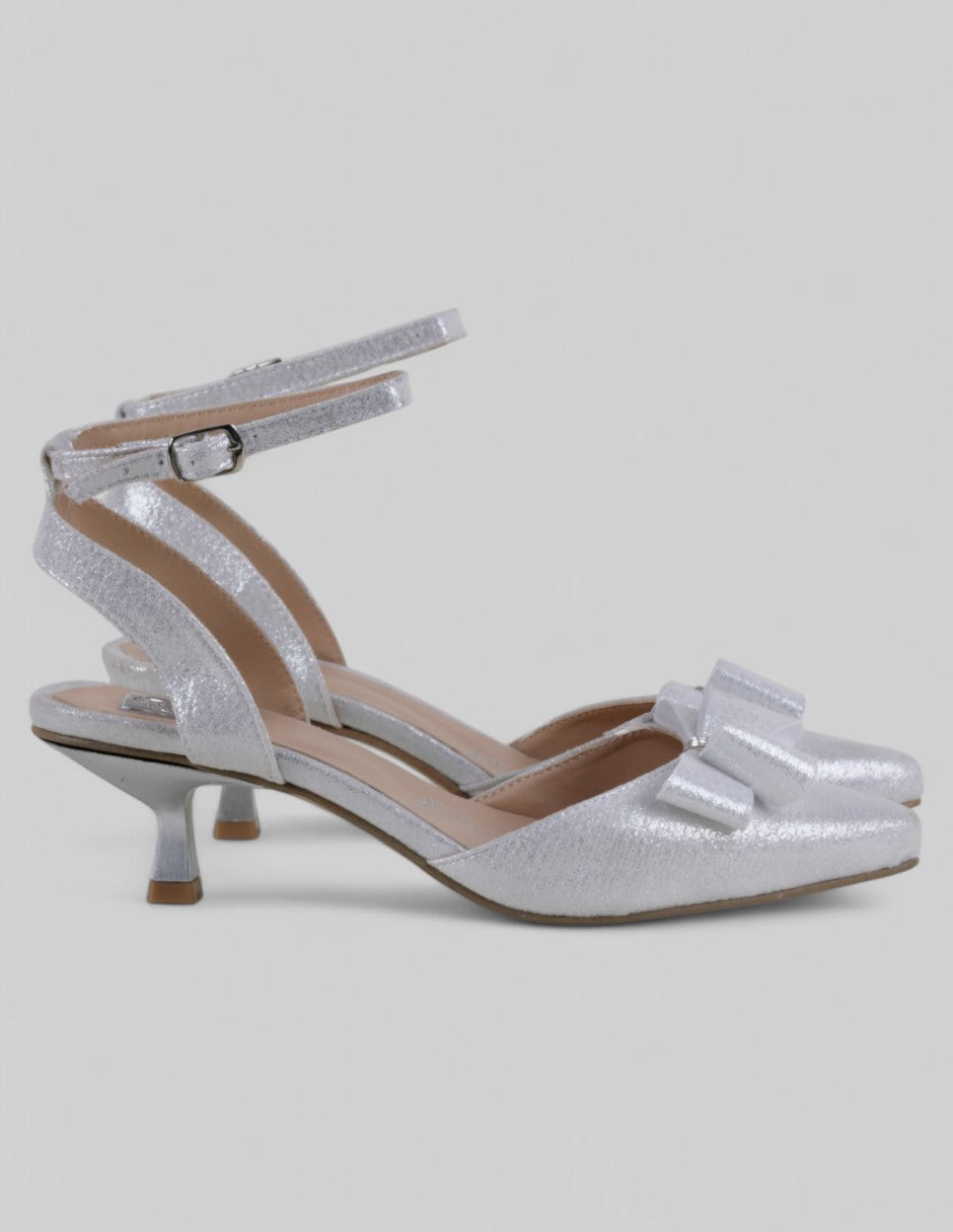 Las zapatillas LEON en textil color plata destacan por su diseño femenino. Con una elegante punta cerrada, talón descubierto y con hebilla ajustable. Su tacón delgado estiliza sin perder estabilidad. El acabado metalizado y el moño decorativo añaden un toque delicado. Ideales para atuendos con personalidad. ¡Un par que eleva tu presencia con elegancia sutil!