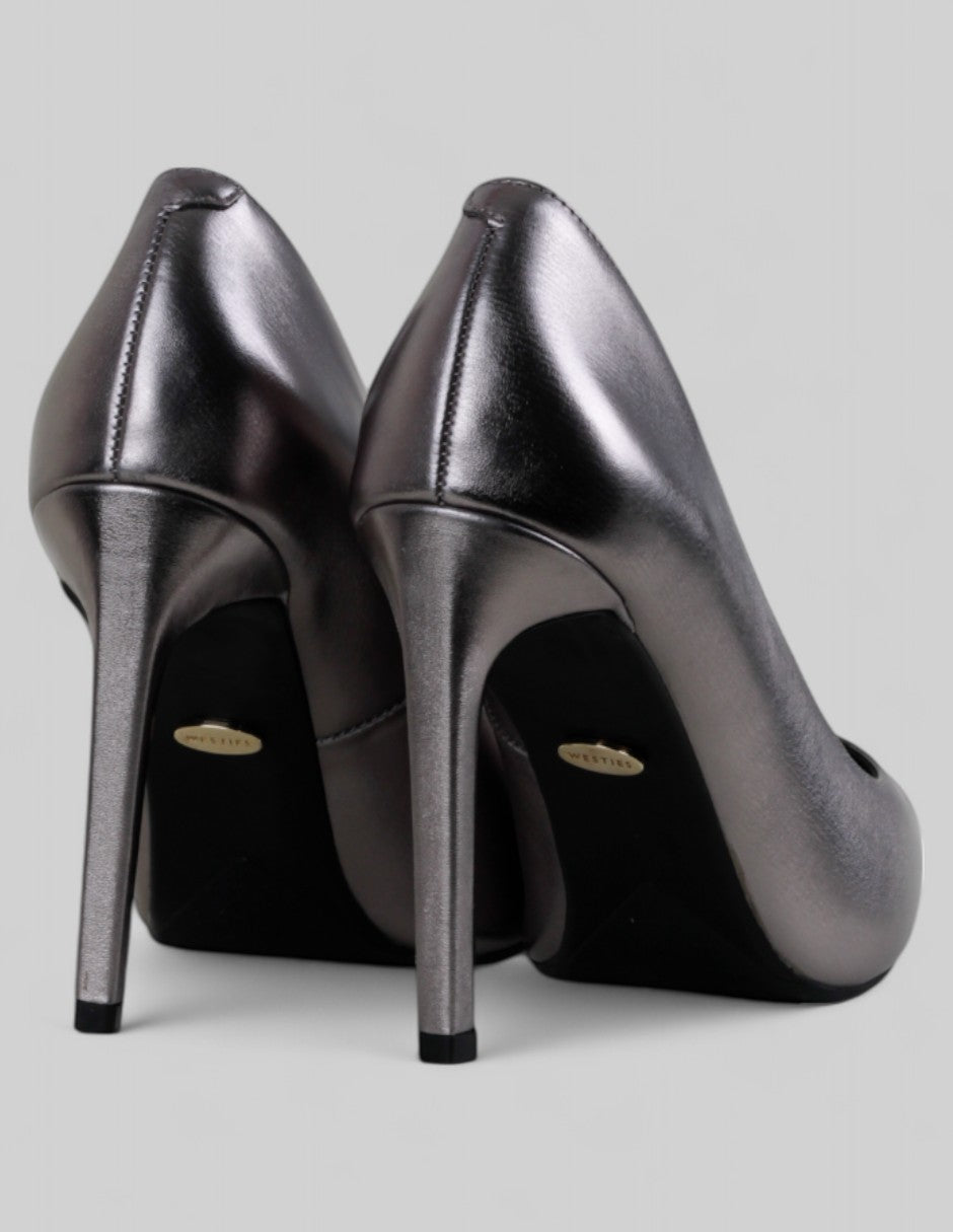 Las zapatillas sintéticas color plata para mujer de WESTIES combinan brillo metálico y estilo clásico. Su diseño con tacón delgado y punta cerrada estiliza al instante, ideal para looks formales o eventos especiales. ¡Hazlas tuyas y transforma cualquier ocasión en un momento inolvidable con presencia y elegancia!